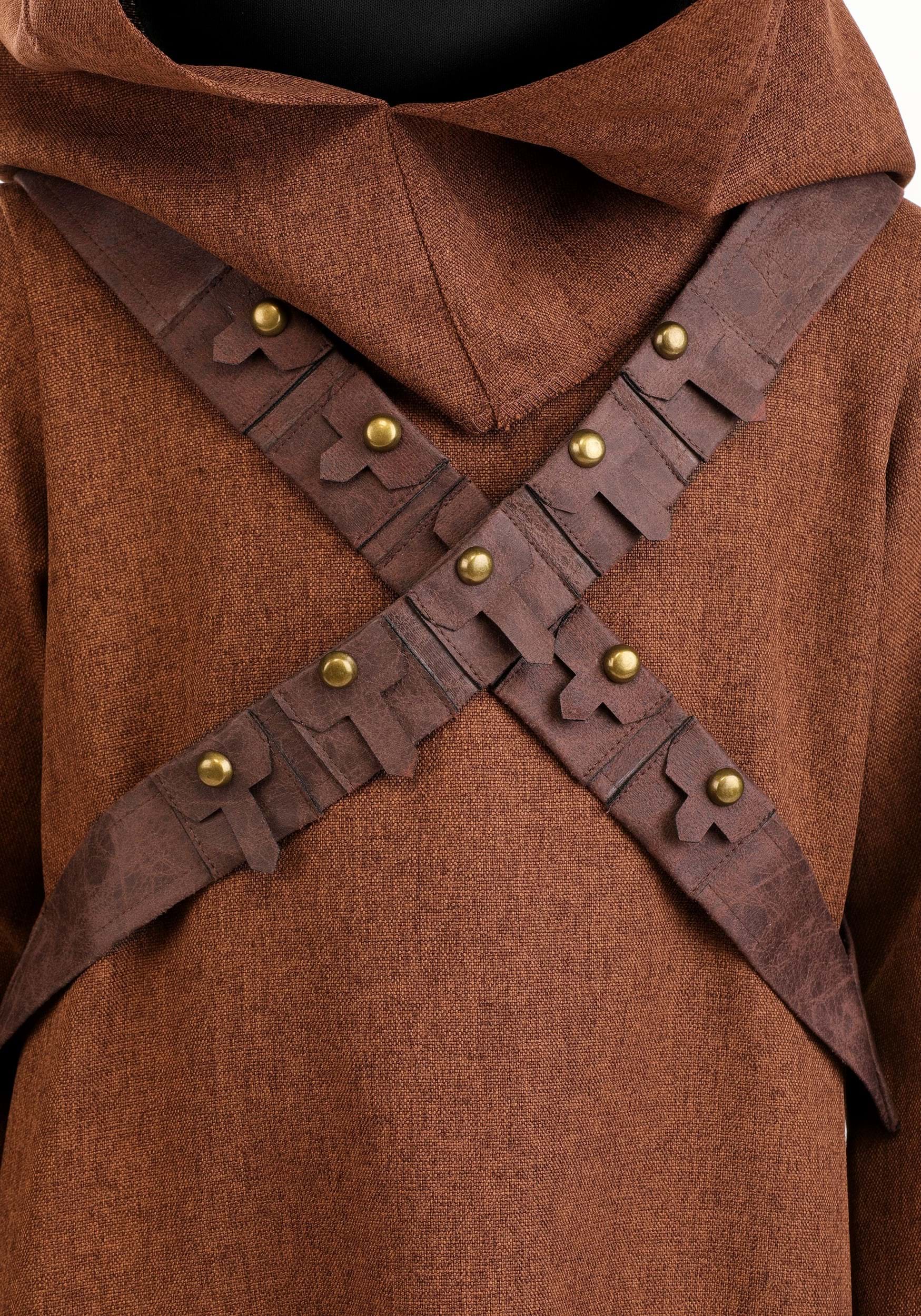 This costume includes two adjustable crossbody belts that feature faux suede pouches. The ornamental pouches enhance the authentic Jawa aesthetic, adding a fun, functional touch to the outfit.