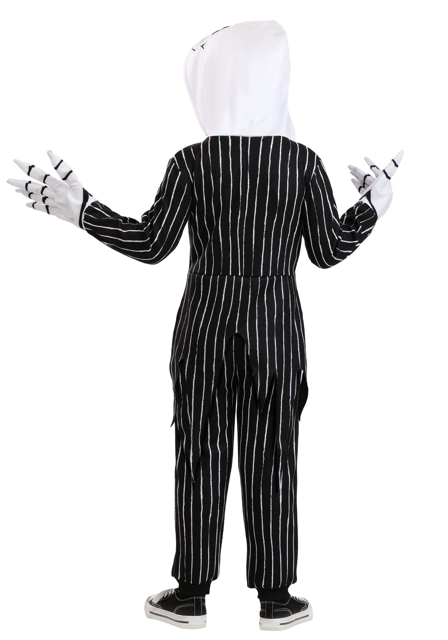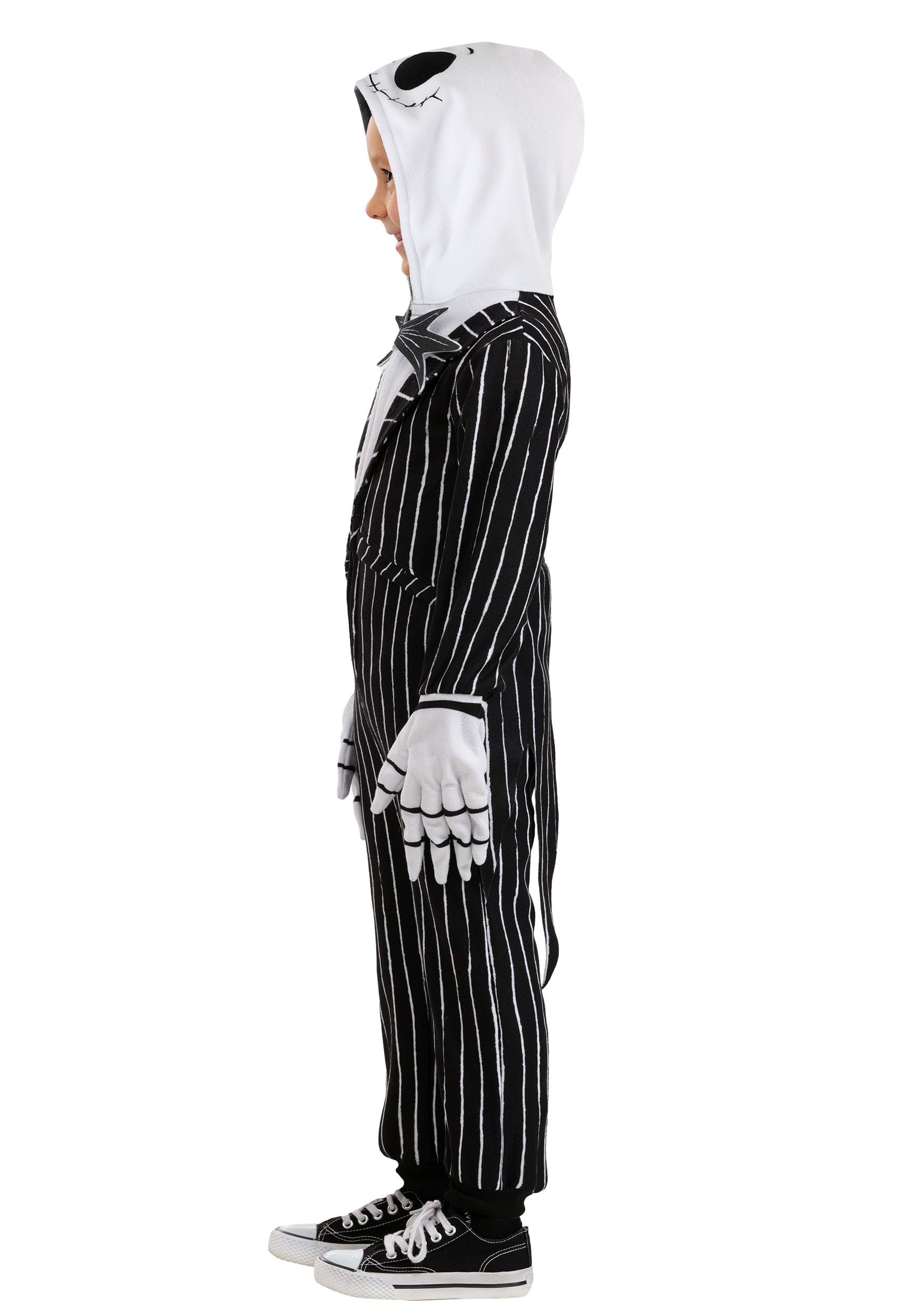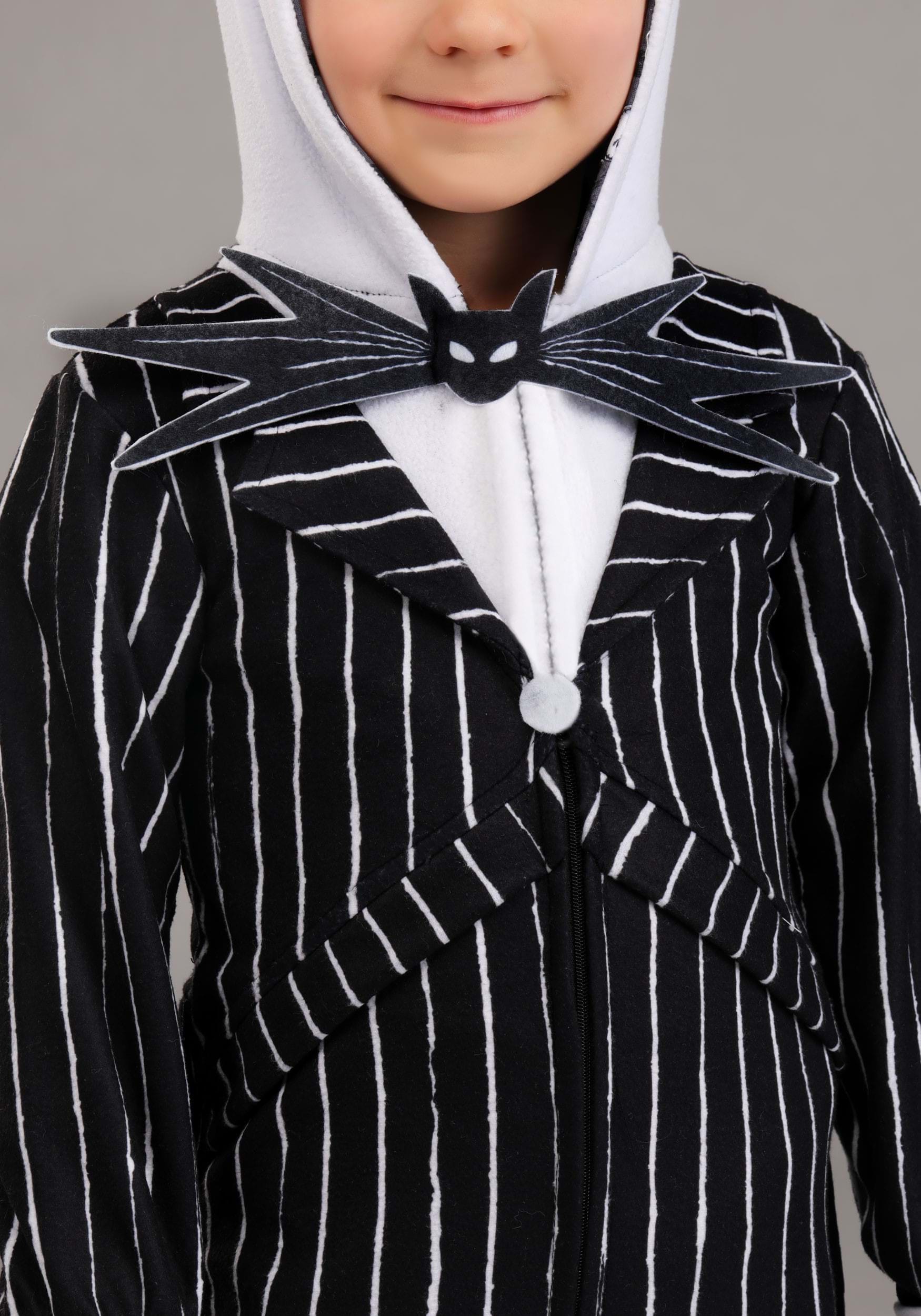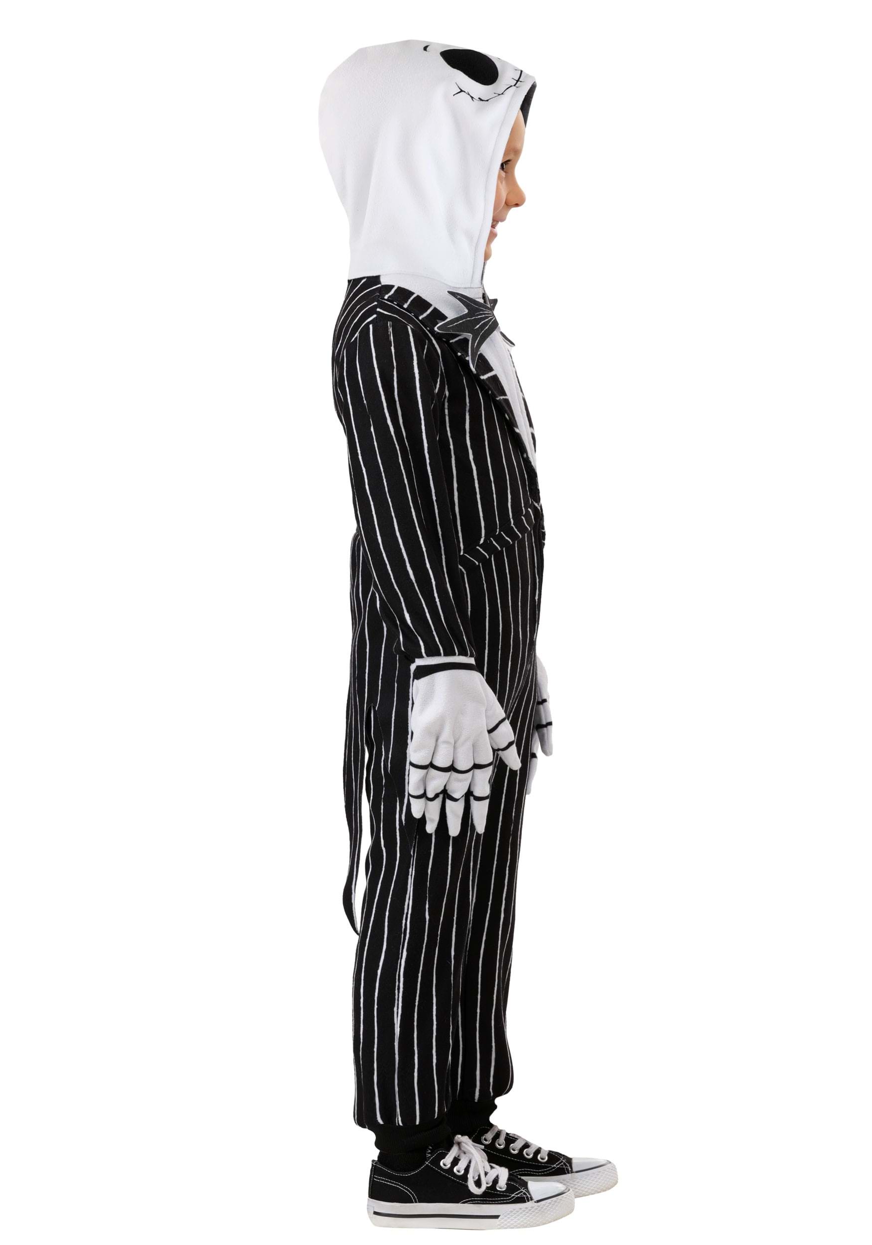 The onesie features a convenient front zipper, allowing for easy fitting, along with attached gloves at the cuffs to keep their look complete without the hassle of extra pieces. Crafted from soft, cozy fleece, it's warm enough for cooler weather and gentle for your little one. The hood displays a detailed print of Jack Skellington's friendly grin, while the body is designed with his pinstripe suit.
