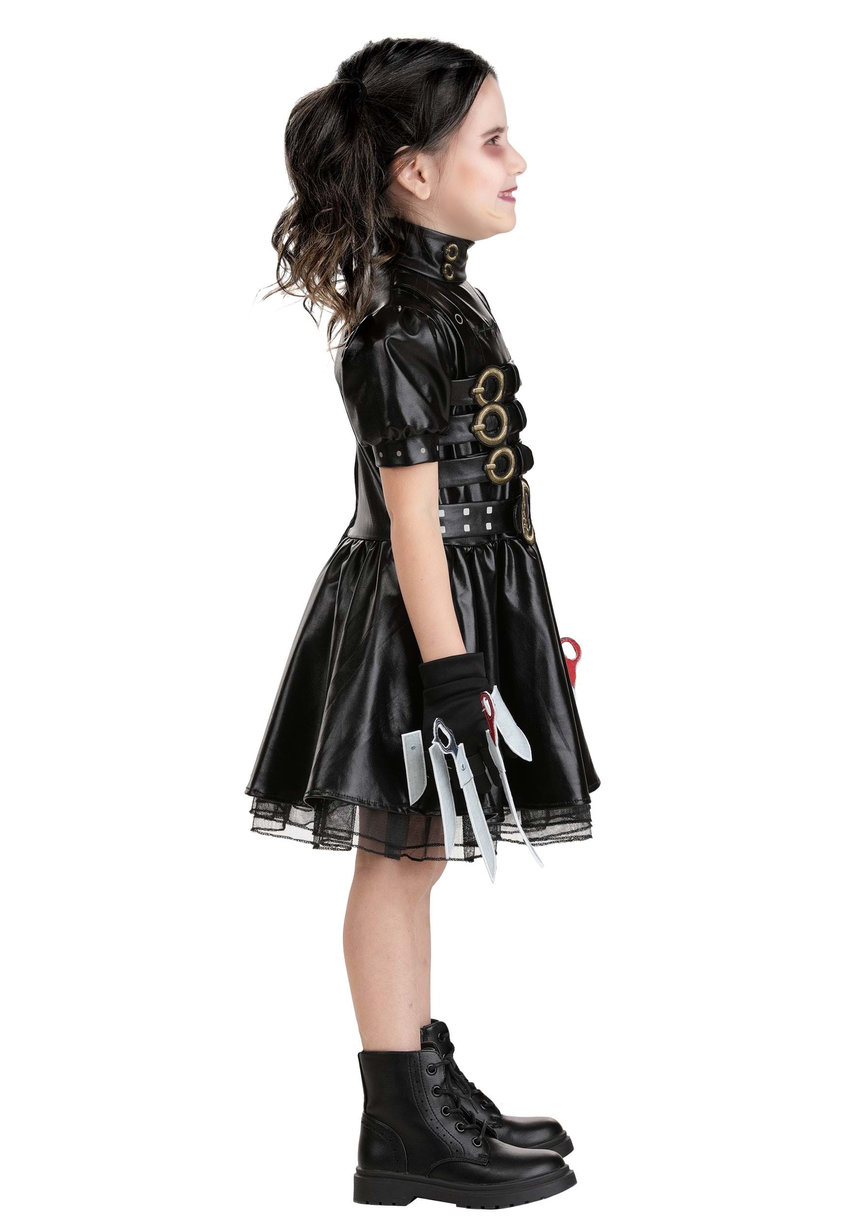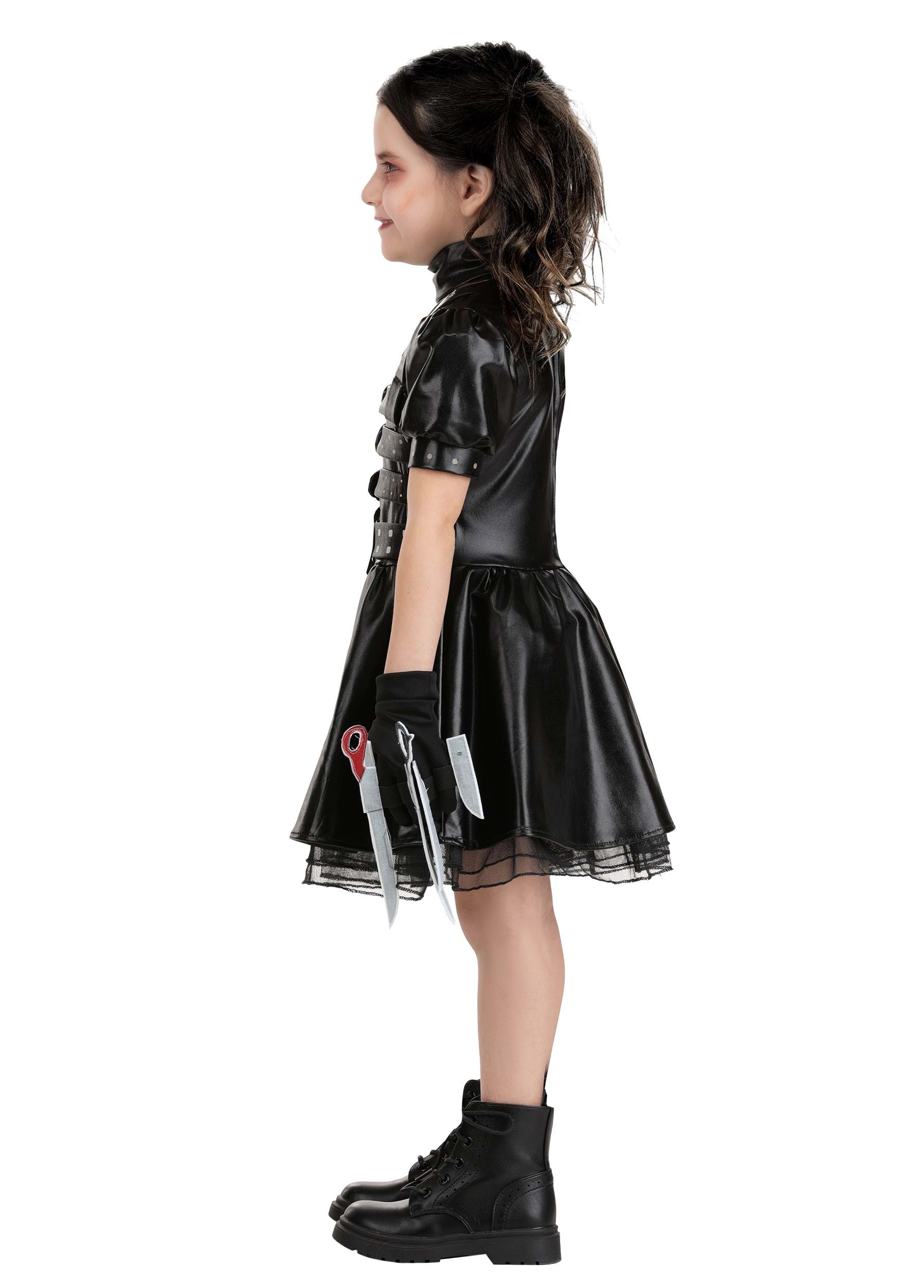 Designed for tiny trick-or-treaters, the faux vinyl dress offers a four-way stretch fit, allowing easy movement for toddling adventures. The satin inner liner ensures a cozy feel against delicate skin, while a zip-up back makes dressing up as effortless as a flick of Edward's scissor-fingers.