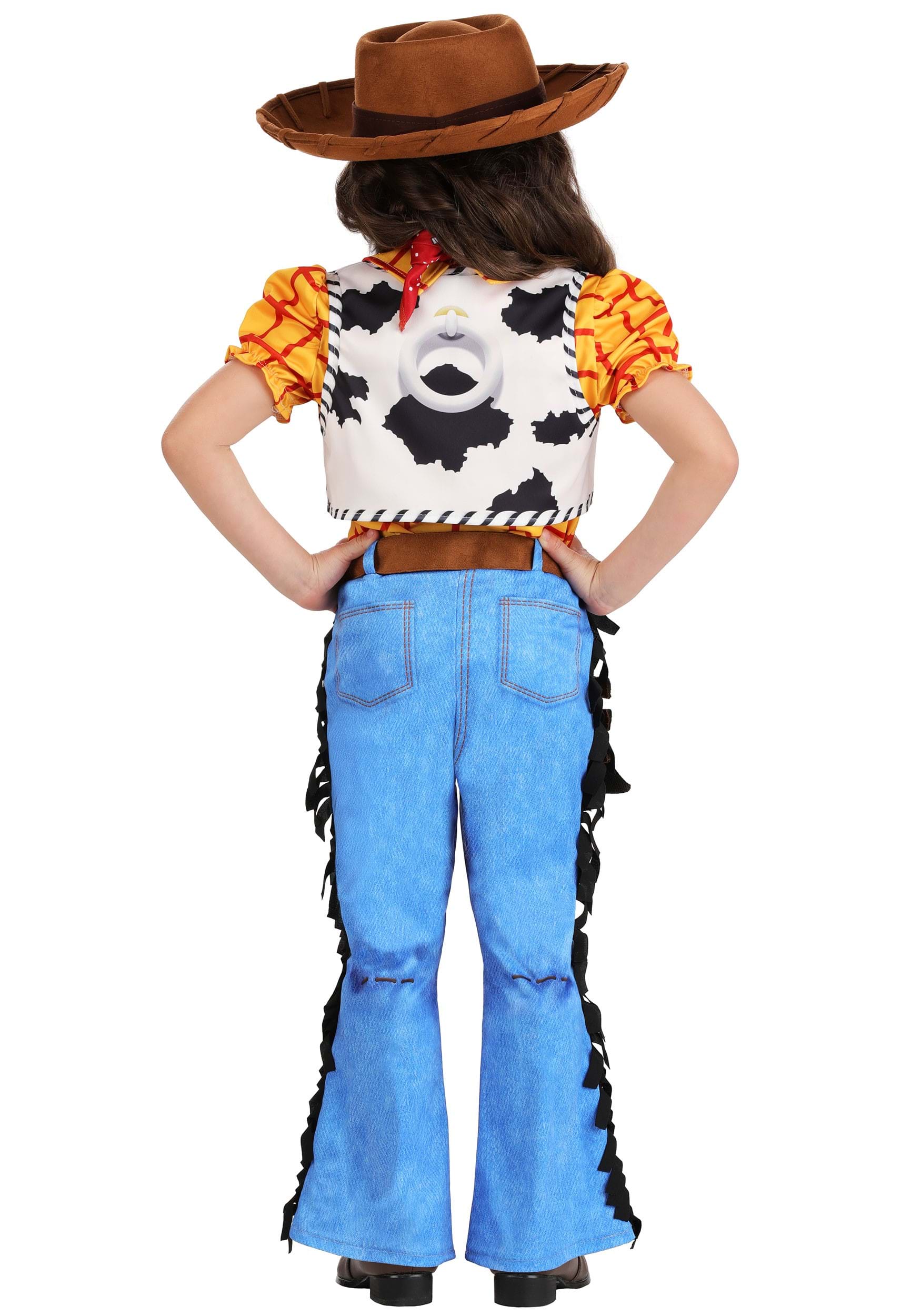 The shirt pulls on with ease and features elasticized puff sleeves and decorative buttons. The cow-print vest with Sheriff badge and printed pull string adds classic Woody flair. Fringe-trimmed pants have an elastic waistband for a secure fit, while the included holster belt, soft red scarf, and a suede-style stitched cowboy hat make this costume ready for every candy-collecting adventure.