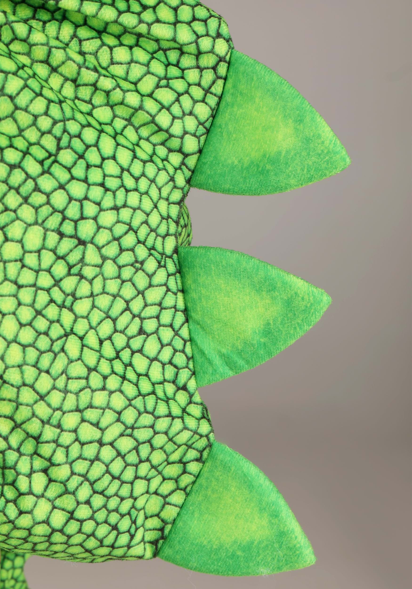 The jumpsuit is made from a shimmering green polyester fabric designed to mimic reptilian skin, complete with a zip-up front for easy dressing and bathroom breaks. An impressive row of plush orange spikes runs down the back of the suit and continues onto the lightly stuffed tail for that unmistakable iguana silhouette.