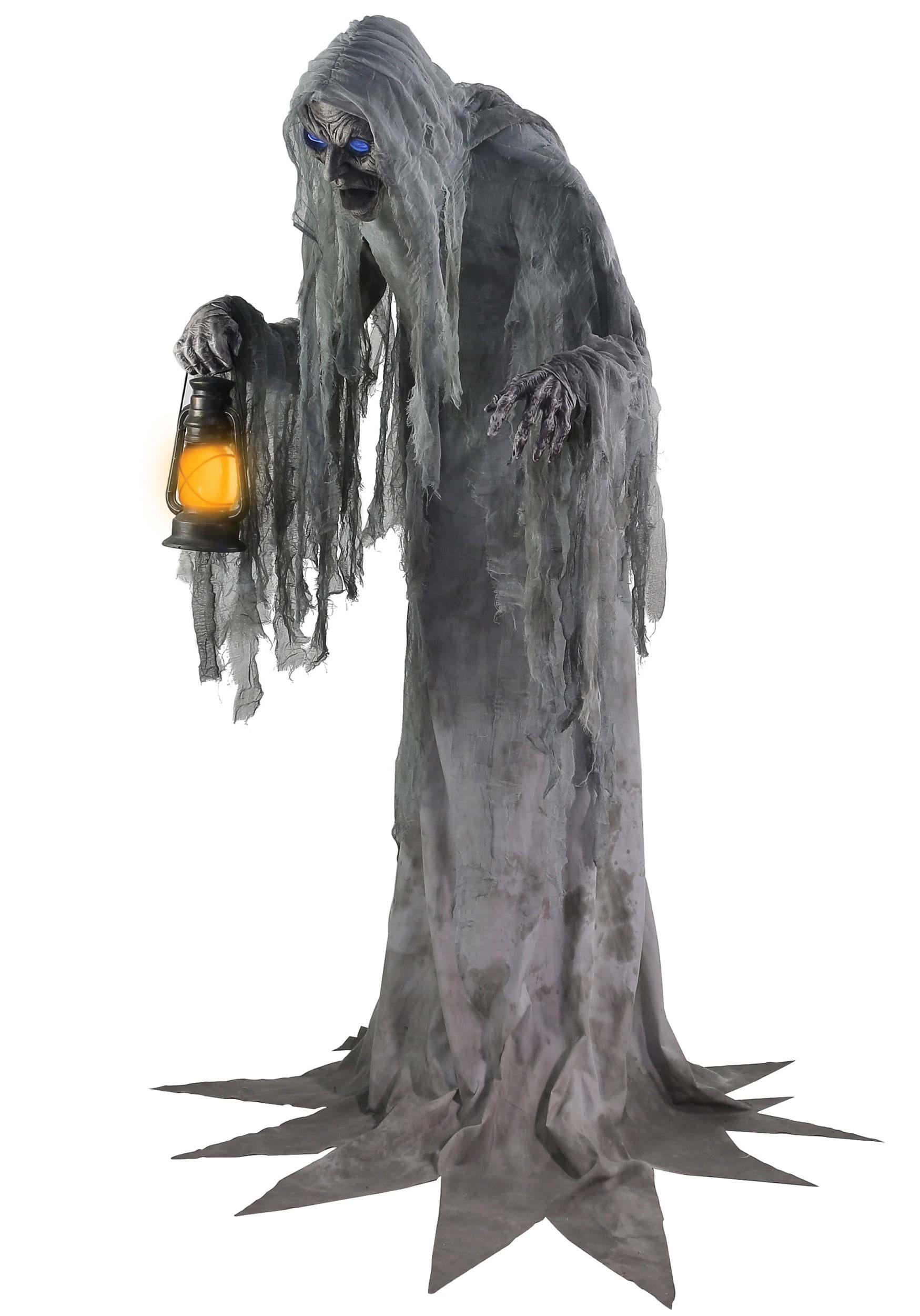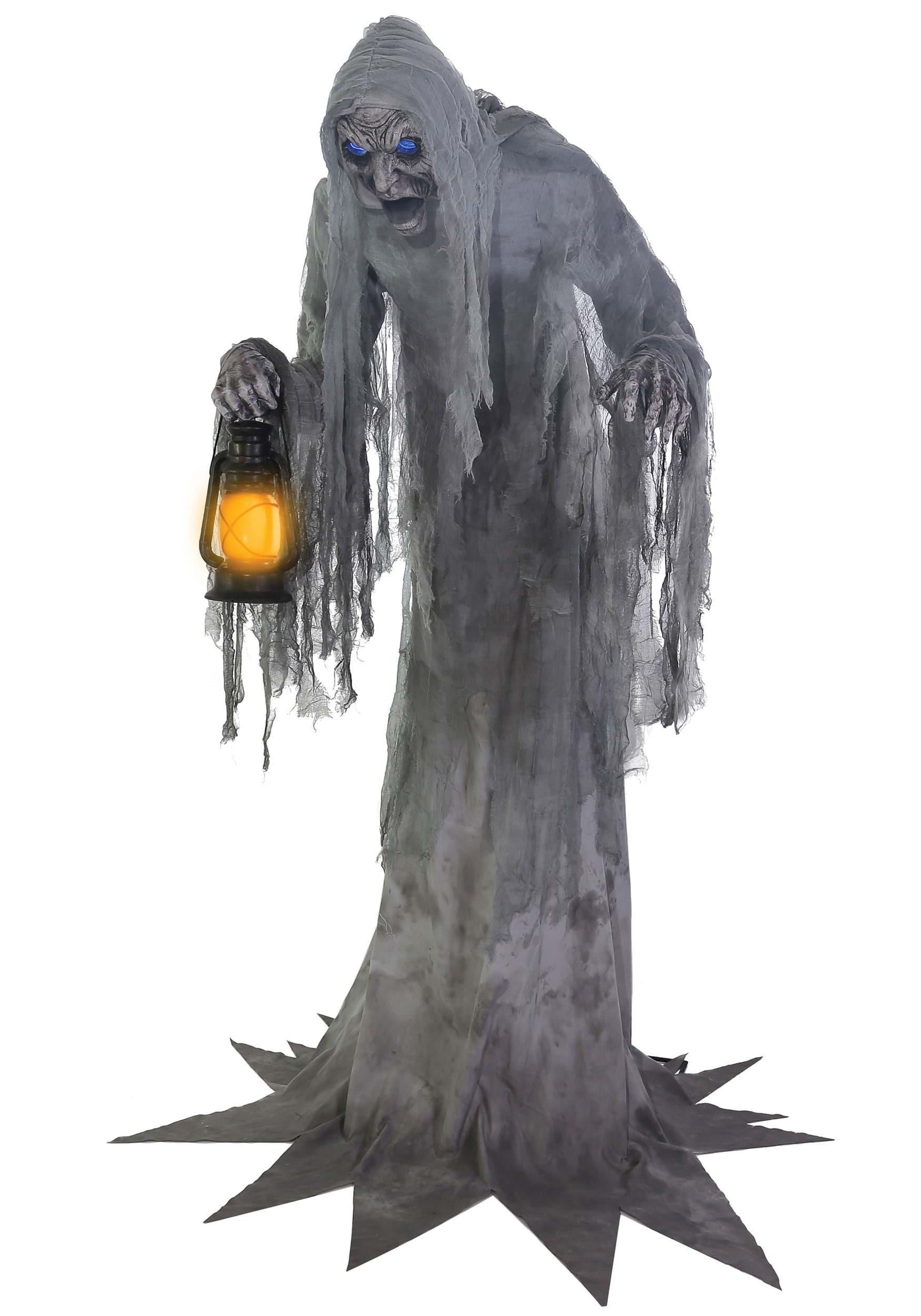 Clutching a flickering lantern in one gnarled hand and dragging the other behind like a fading memory, the phantom slowly moves, as if gliding through the fog. Its mouth creaks open to deliver ghostly phrases in a chilling voice that echoes across your display. When the motion sensor is triggered, the lantern sways and the haunting begins.
