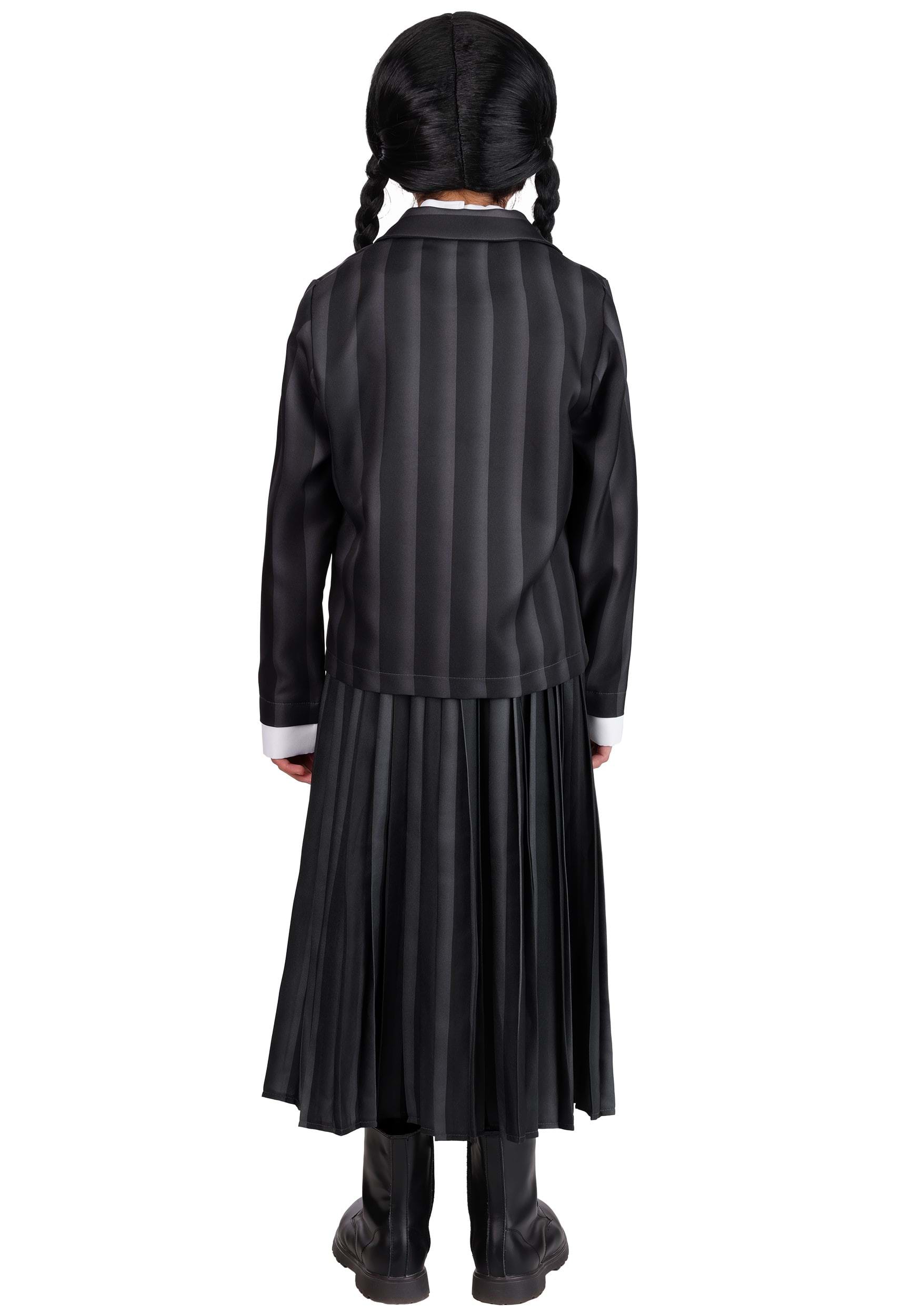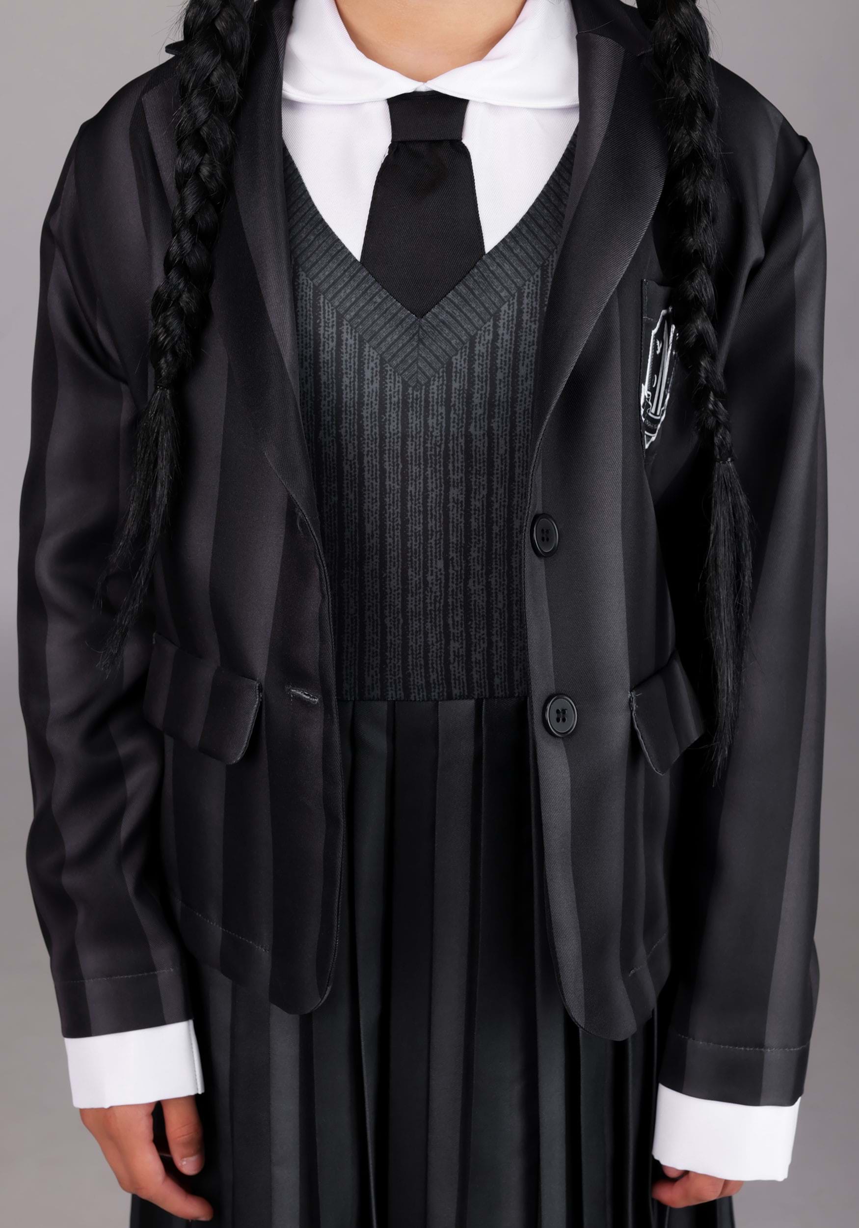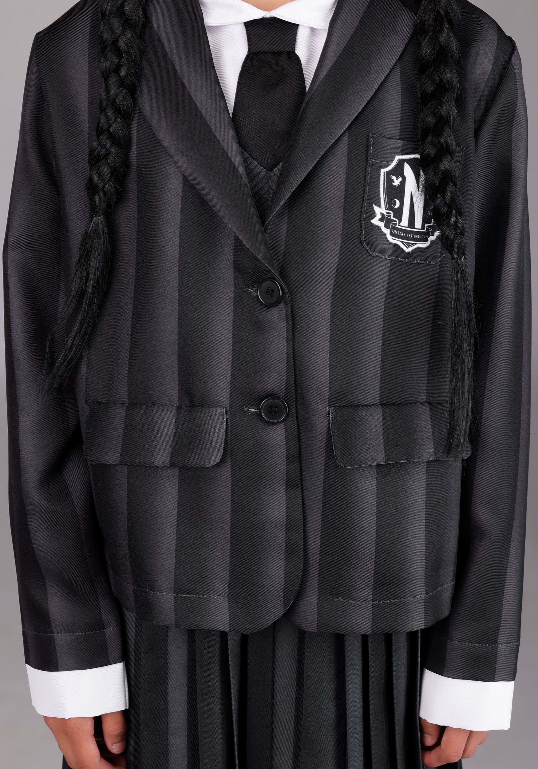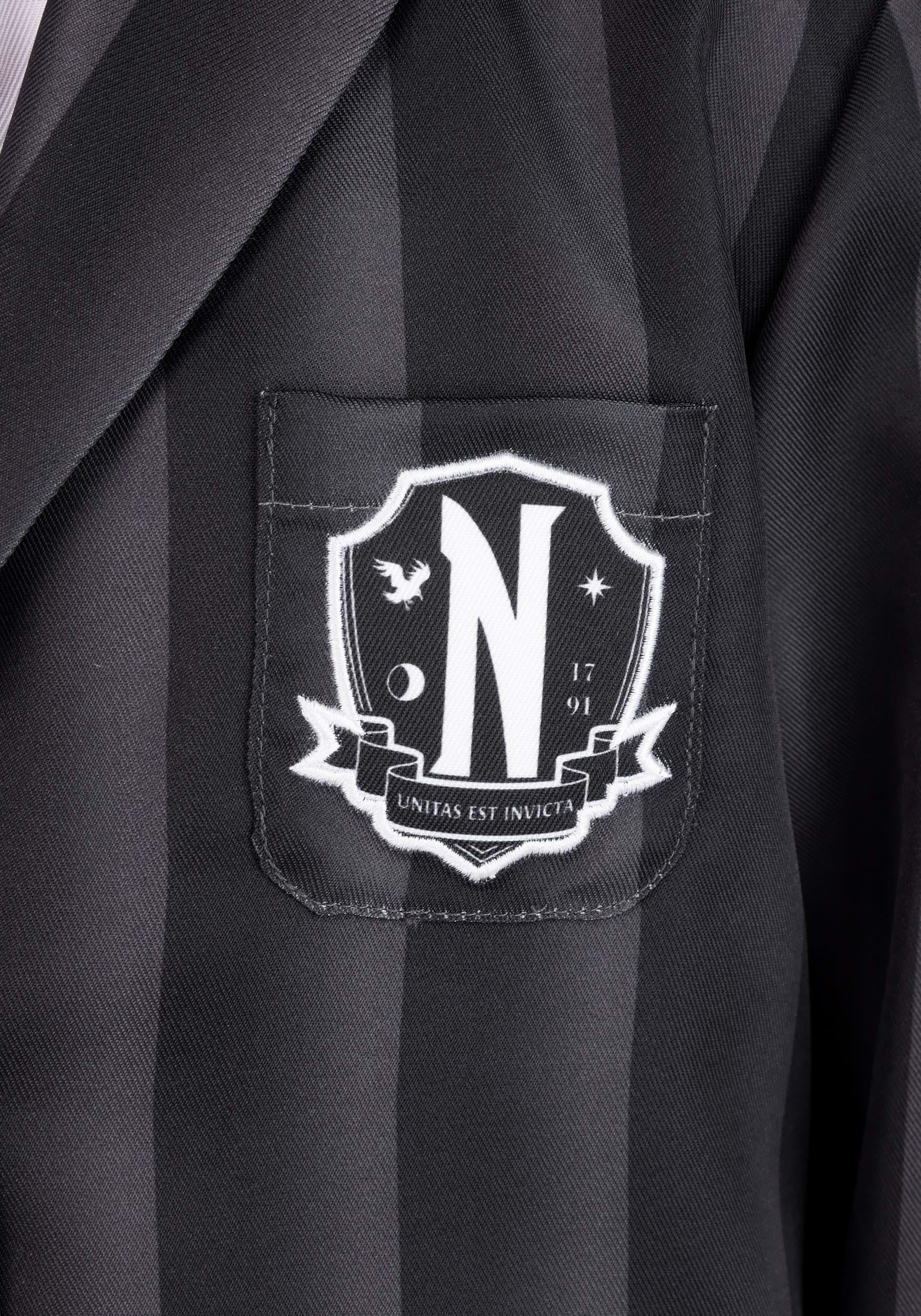 The costume includes a sleek black jacket with subtle grey pinstripes and a button-up front, complete with the iconic Nevermore Academy crest on the chest. It pairs with a matching pleated skirt that features an elastic waistband for easy, comfortable wear—ideal for solving supernatural mysteries or delivering a dry one-liner with arms folded.