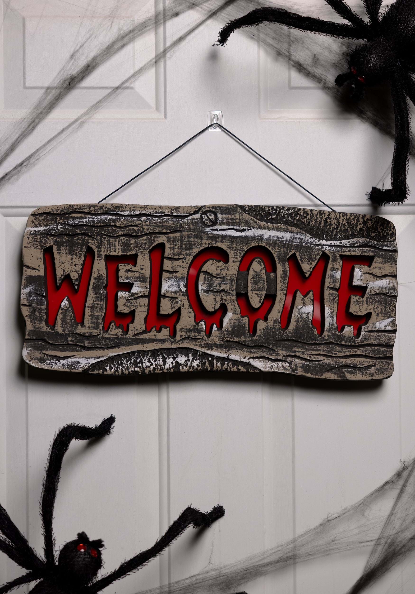 Constructed from foam, this sign is designed to look like distressed wood—because, naturally, nothing says hospitality like a piece of wood that’s seen better days. The letters spelling out "Welcome" are, of course, smeared in what can only be described as "definitely blood." And if that wasn’t unsettling enough, the whole thing lights up with an ominous red glow when you turn it on.