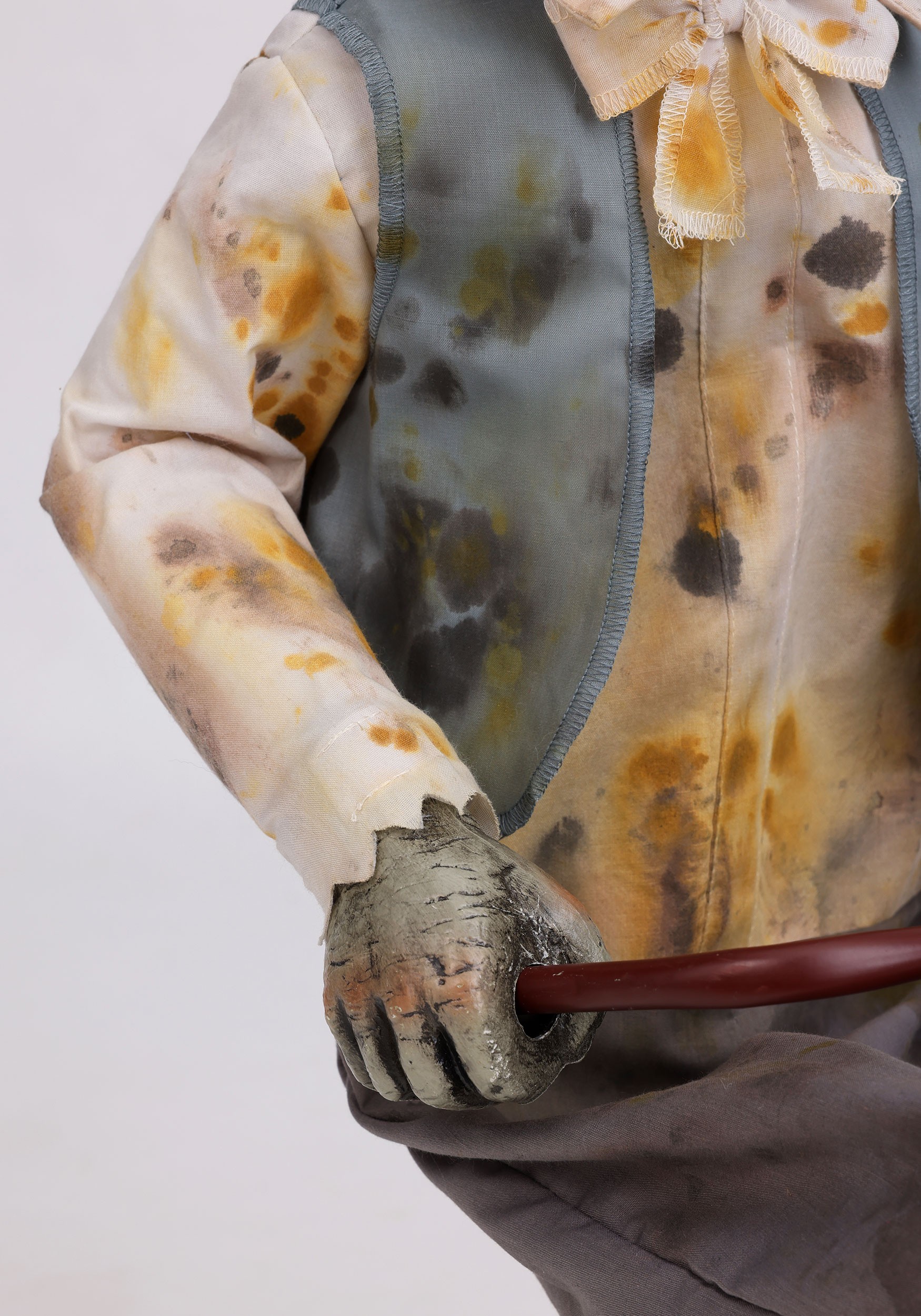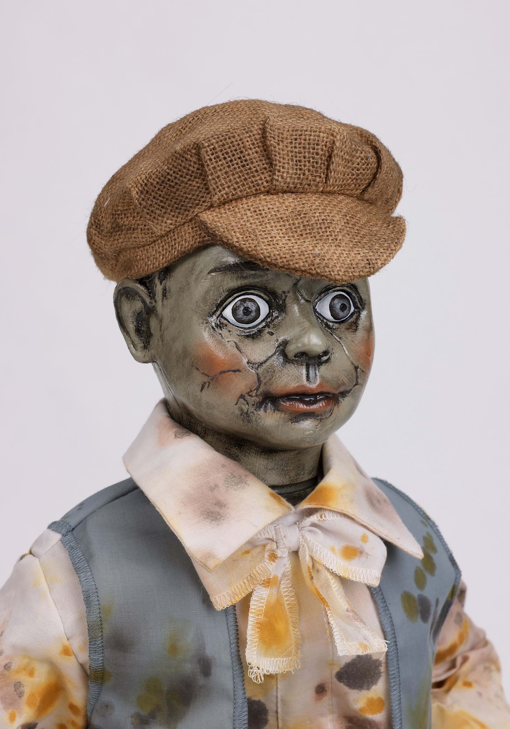 Every detail of Wheels McGee gives him a memorable personality. His outfit features polyester fabric clothing styled like a vintage child's attire, complete with a jaunty cap and classic vest. Beneath the costume, sturdy metal and plastic construction forms the framework of the tricycle and body, creating a durable decoration designed for many spooky seasons. The painted features and expressive eyes lend him a doll-like charm that feels both nostalgic and delightfully haunting.