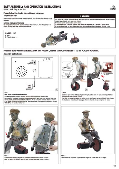 This lively little rider offers several ways to start his midnight journey. Wheels McGee can activate with a built-in motion sensor, manual on/off and "try me" buttons, or a compatible step pad (sold separately) for perfectly timed scares. Powered by four AA batteries, he's always prepared to pedal straight into the heart of Halloween fun.