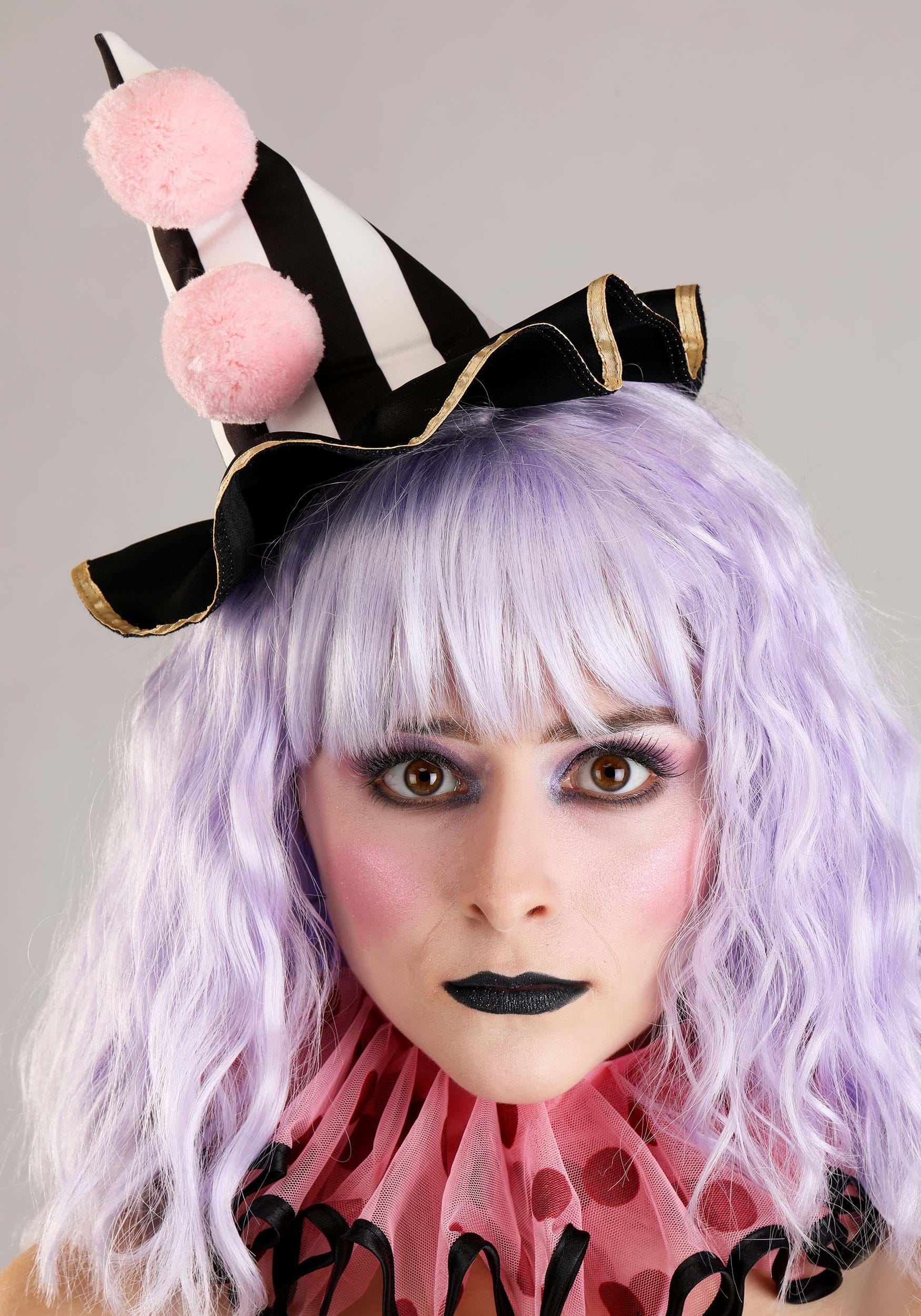 Completing the ensemble is a dainty clown hat with many of the same features as the dress. Black-and-white striped satin shapes the cone, while solid black is used for the scallop-edged brim. Gold trim adds some shimmer, while more pink pompoms ensure it has a playful look. To secure the hat, slip separately sold bobby pins through the hat's attached elastic loops, and you're good to go!