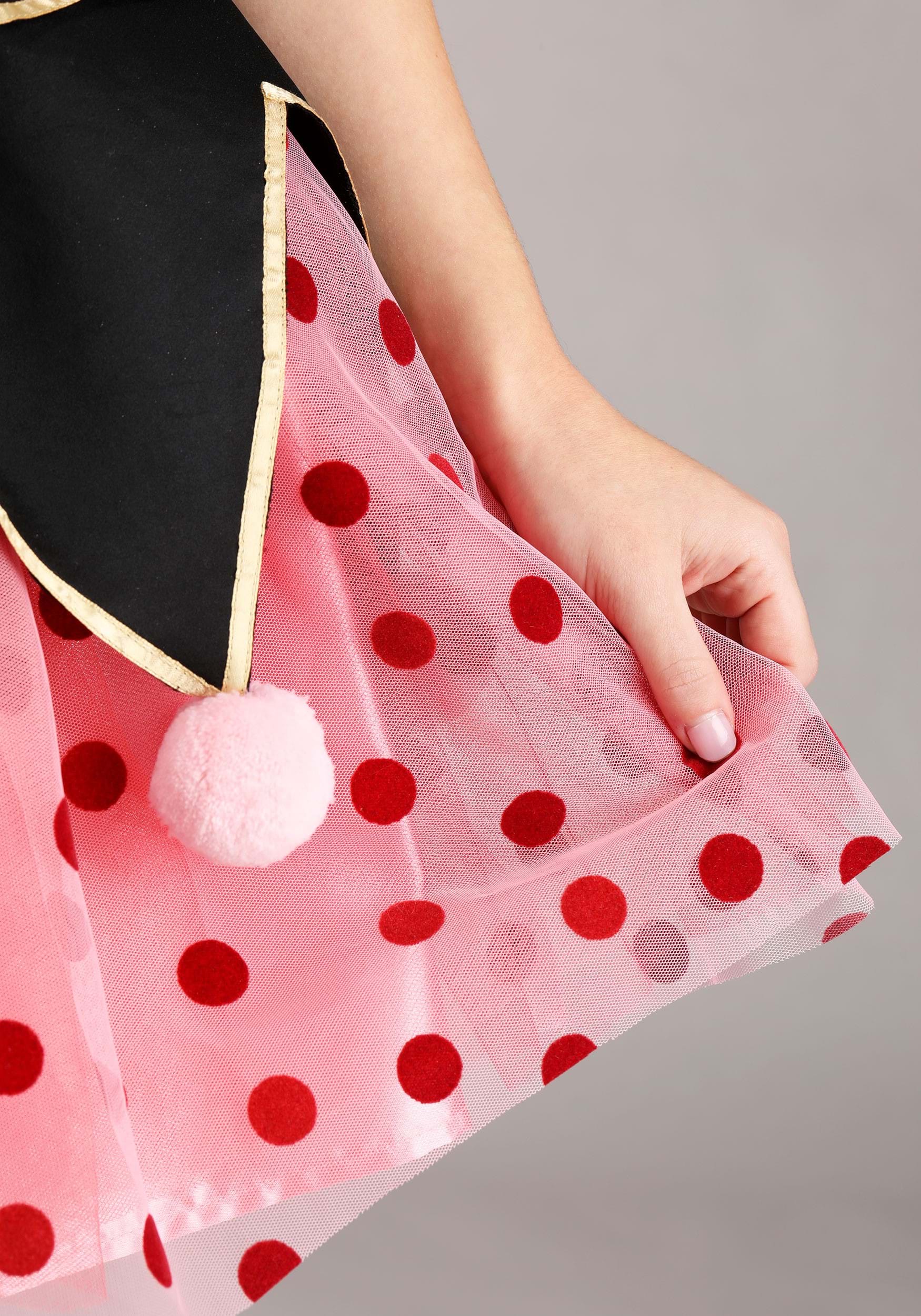 The base of this exclusive costume is a strapless zippered dress made from a mix of materials. A sleek sweetheart bodice with gold accents and pink pompoms starts the garment. A black-and-white striped peplum and zig-zag hem overskirt drape from the bodice to give the costume familiar clown costume style with a twist. Meanwhile, a pink polka-dot tulle skirt gives the costume dress a final touch of playfulness.