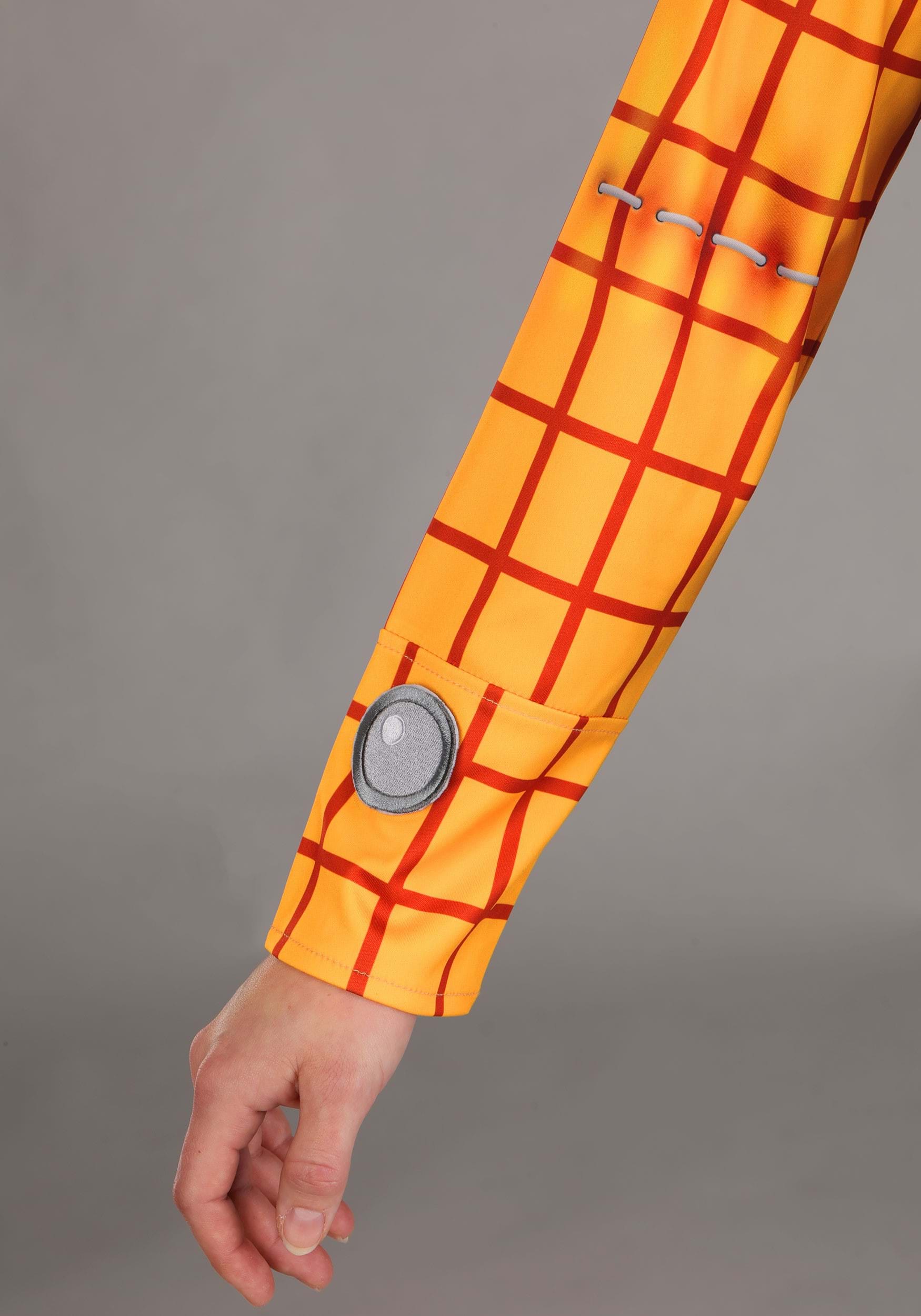 The costume features a jersey pullover shirt with cartoon-bright colors and embroidered touches, a vest with a stitched-on sheriff badge, and printed pull string for back-of-the-box detail. The pants stretch at the waist for easy fit and feature soft side fringe. A matching scarf, belt with attached holster, and a suede-look cowboy hat complete this unforgettable Toy Story ensemble.
