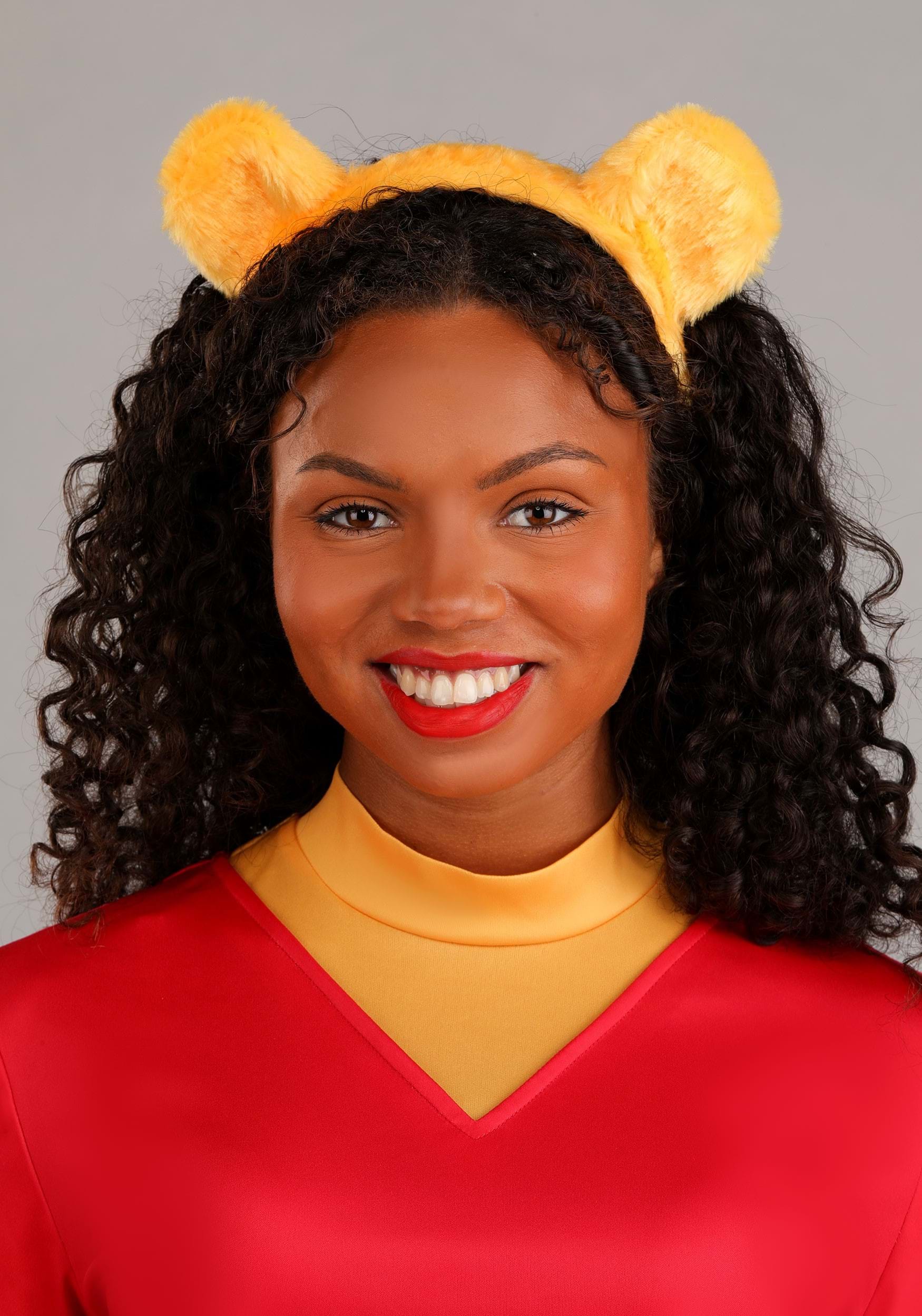 This officially licensed women's Pooh Bear costume starts with lightweight jersey knit long-sleeved mock neck shirt layered under a red V-neck tee. The close fit top is made easy to wear with a hidden zipper down the back. Plush faux fur fabric is used to shape a short pull-on skirt with an elastic waistband. Complete the outfit with the plush fabric-wrapped headband with Pooh ears!