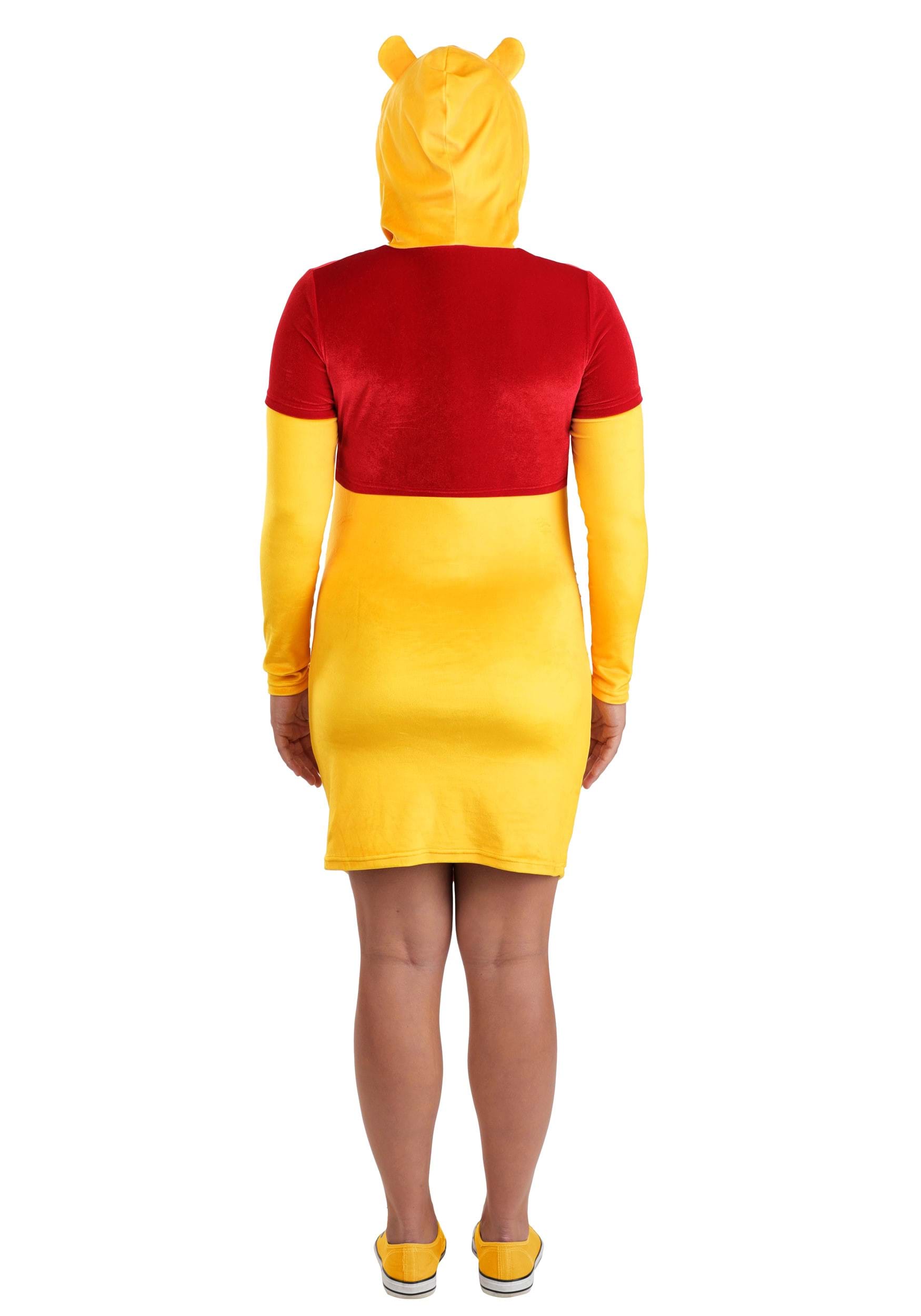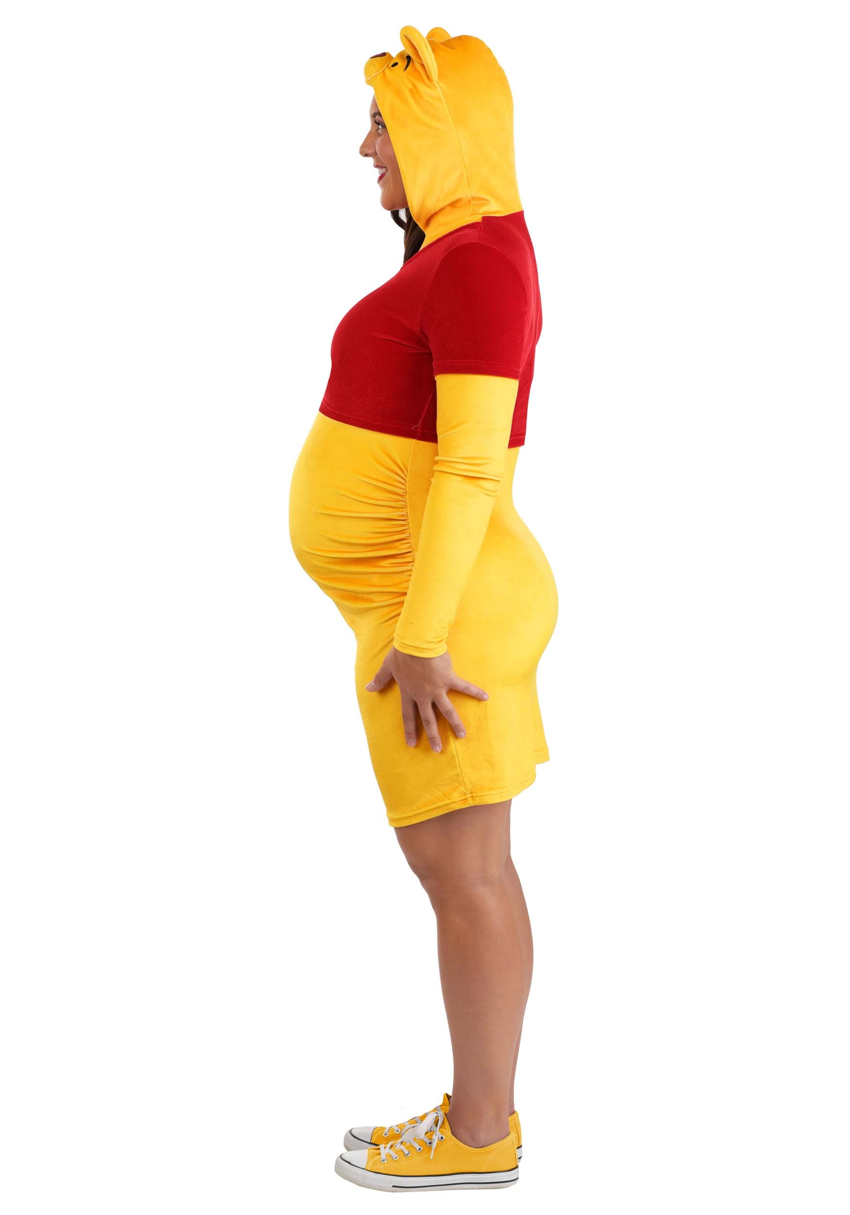Starting with a fitted long-sleeve dress, this officially licensed costume is a sleek, full-coverage maternity style. Meanwhile, its stretch materials ensure it is cozy and comfortable. An attached red V-neck shirt is layered over the golden yellow dress to recreate Pooh's signature style. Completing the look is an attached hood with soft-sculpted structure, embroidered facial features, and a jersey lining.
