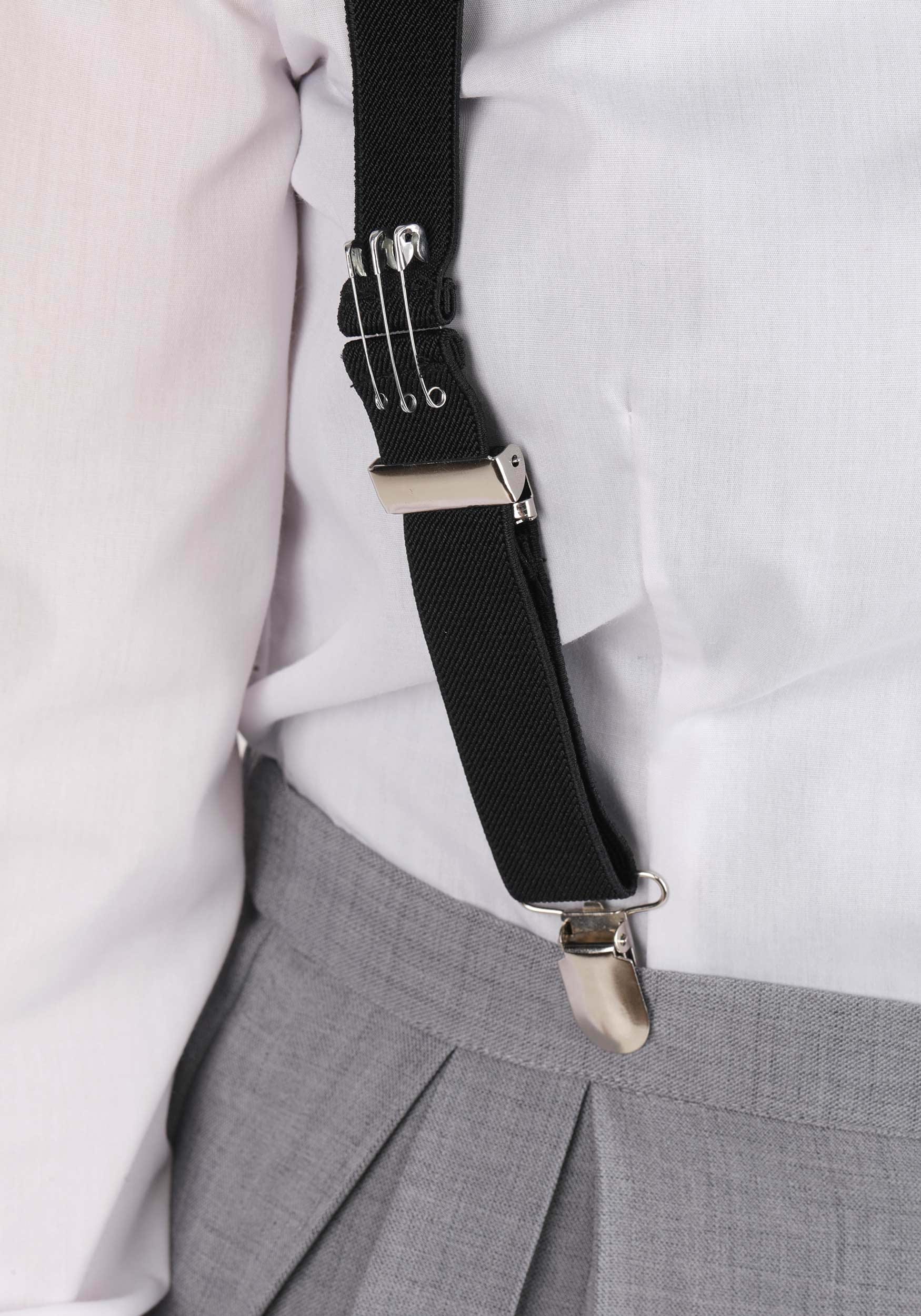 - Length adjustable elastic suspenders secure to pants on front and back, decorative safety pins