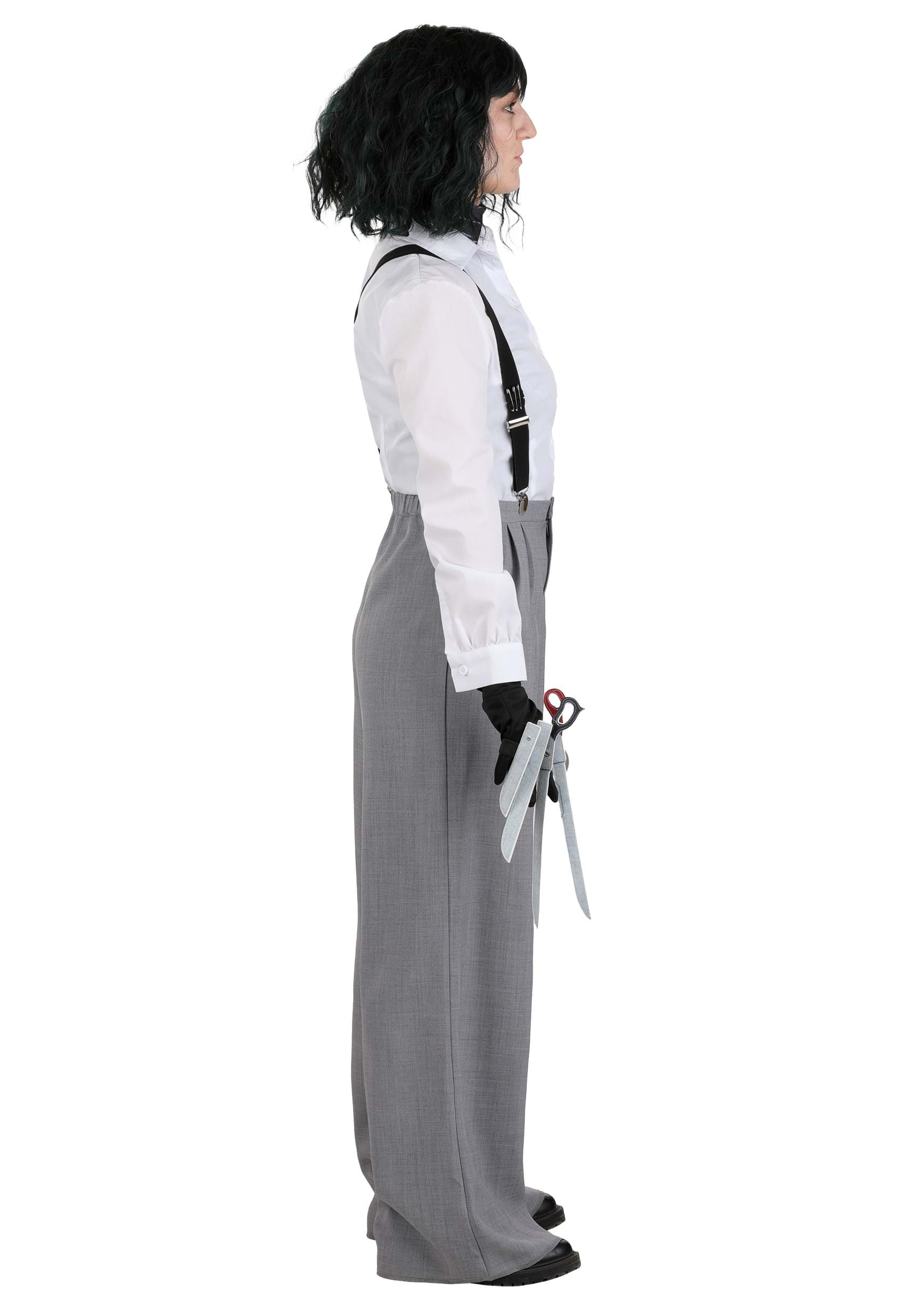 This women's Edward Scissorhands costume includes a white button-up shirt and high-waisted gray slacks that recreate the look of Edward's refined yet eerie suburban neighborhood outfit. The stretch poly-cotton shirt keeps things light and comfortable, while the pants, crafted from a poly-spandex blend, feature reverse box pleats and an elastic panel in the back.