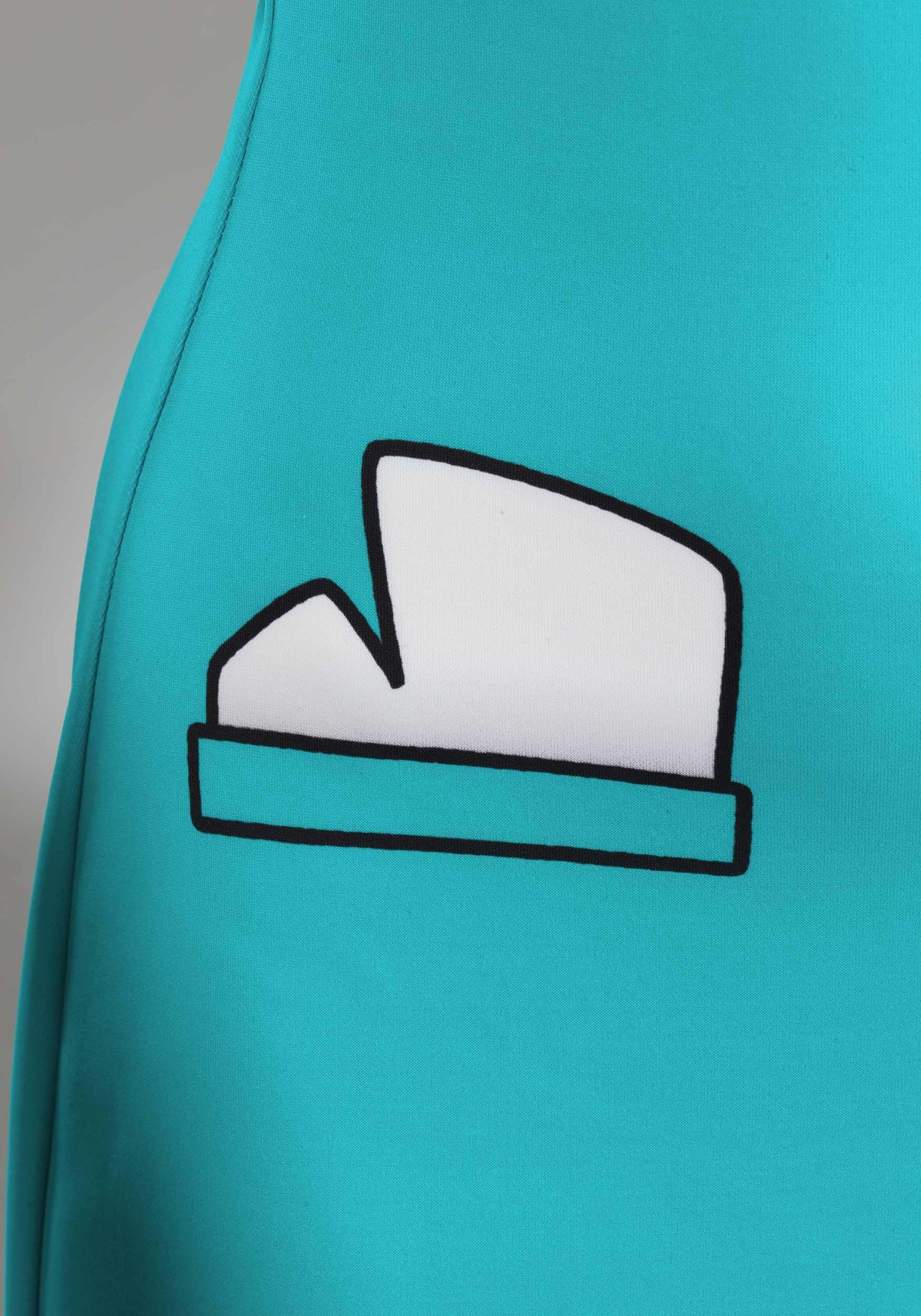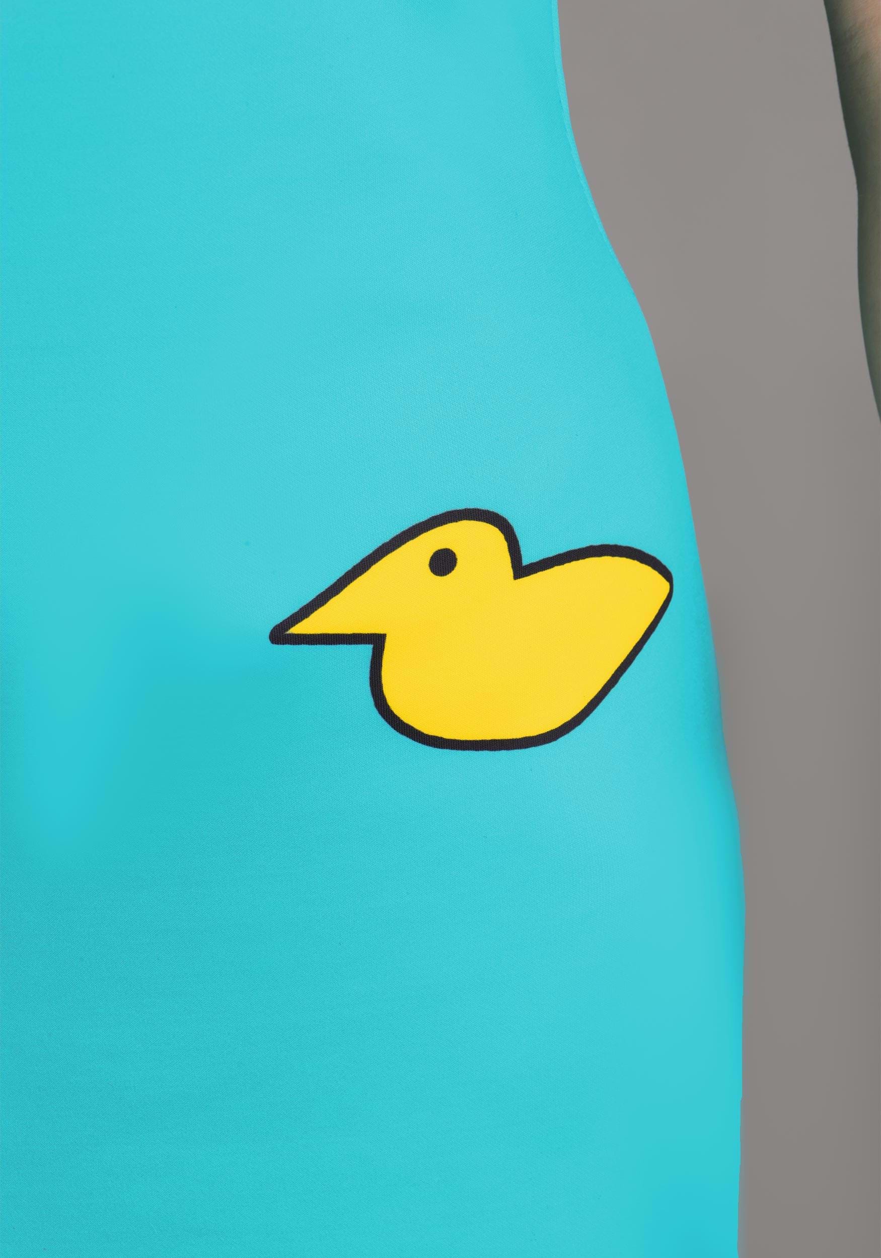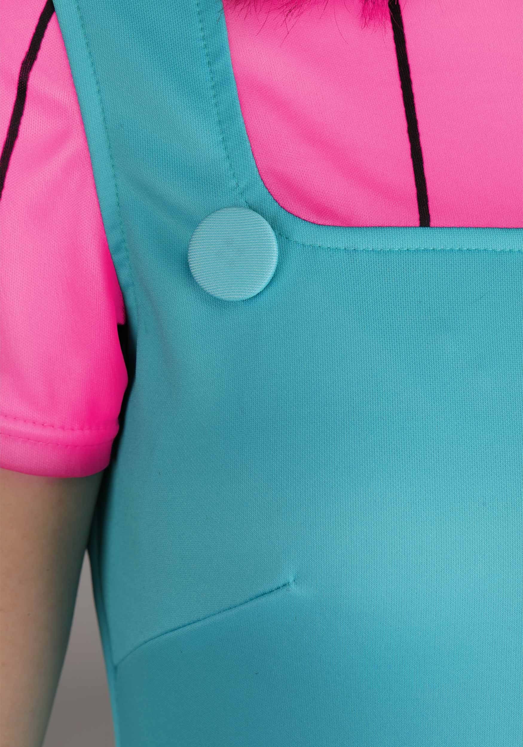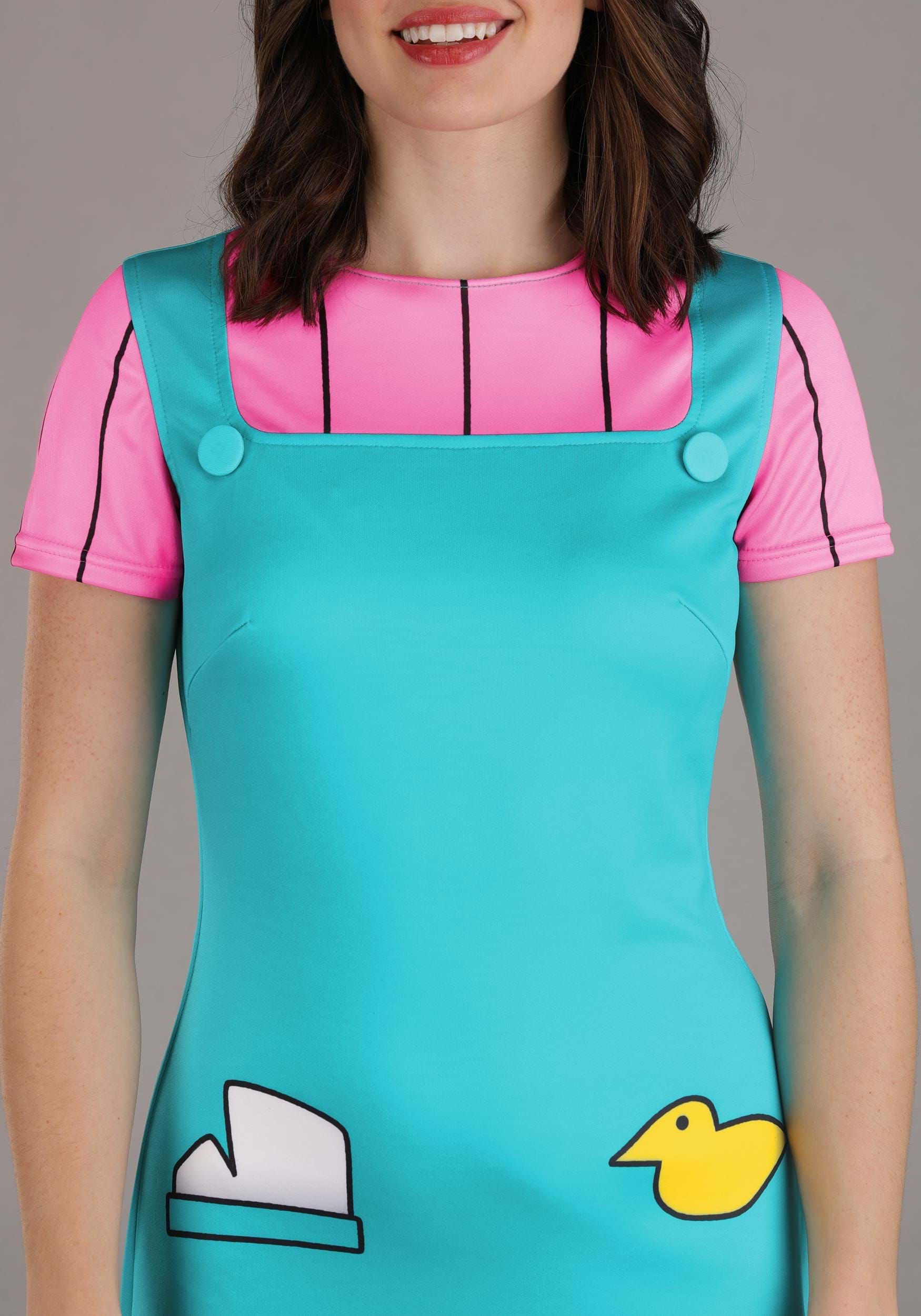 The costume features a bright pink short-sleeved shirt with black line details, sewn beneath a turquoise jumper-style dress. The printed graphics on the dress—including the yellow duck and faux pocket—perfectly mirror Lil’s signature look, making it instantly familiar to fans of the show. Built as a single-piece dress for easy wear, this outfit keeps the spirit of the character front and center.