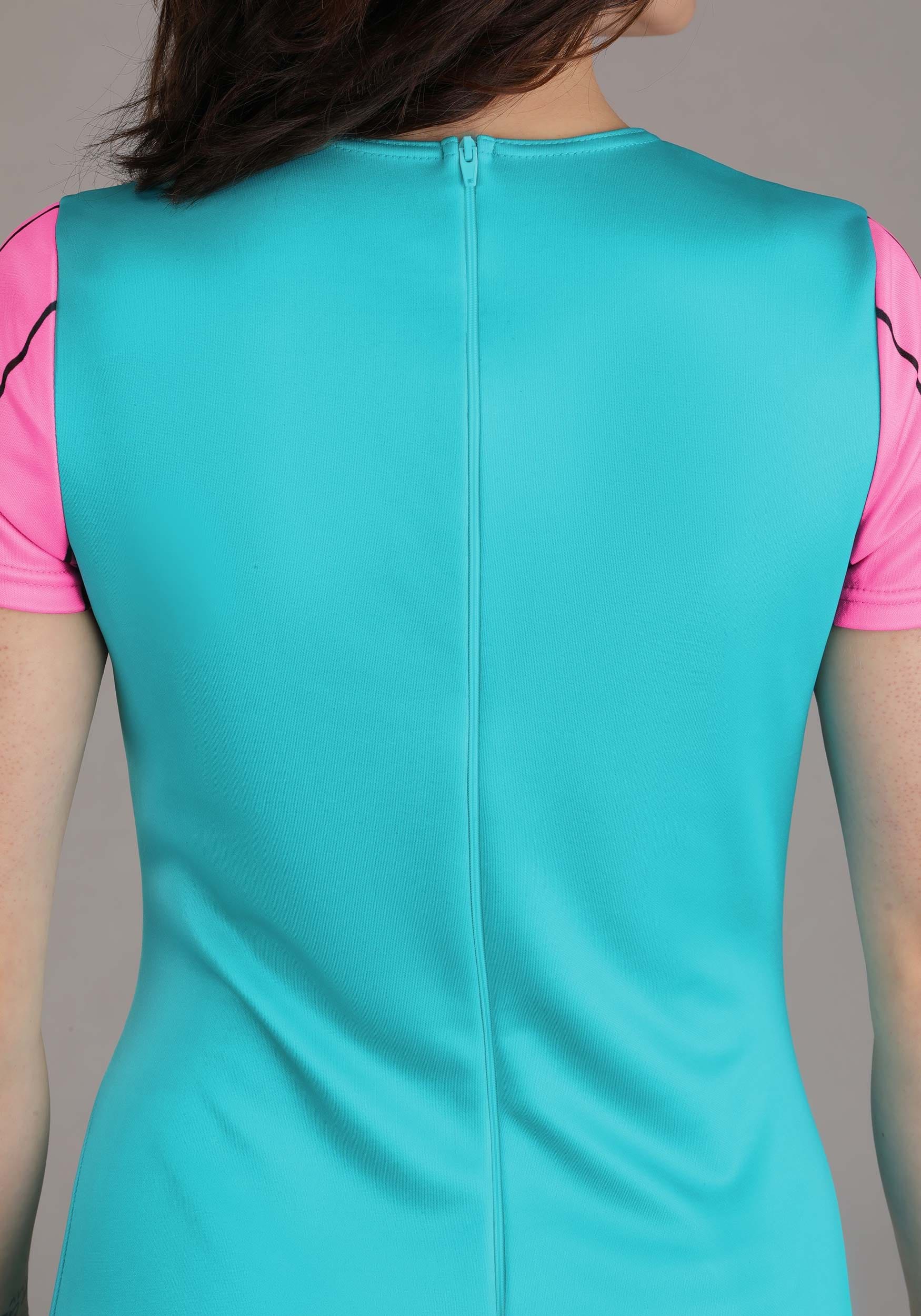 - Printed scuba knit dress has jersey knit striped chest and sleeves, zipper down center back