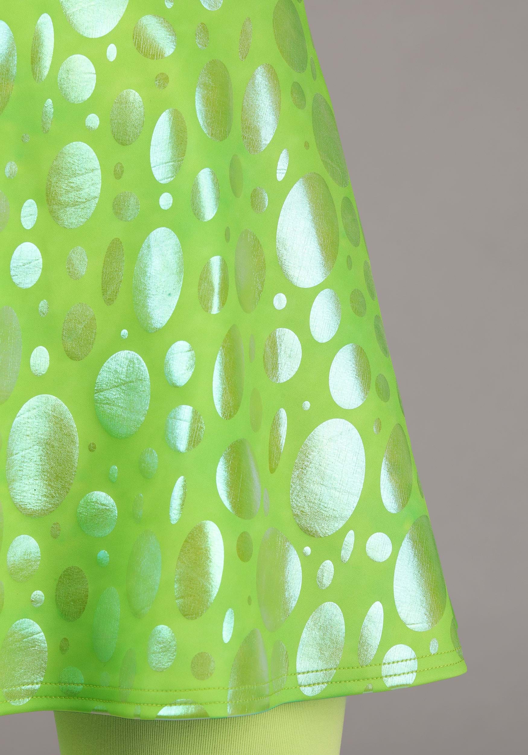 - Scuba knit skirt has all over, iridescent clear foil details, jersey knit teeth, elastic waistband
