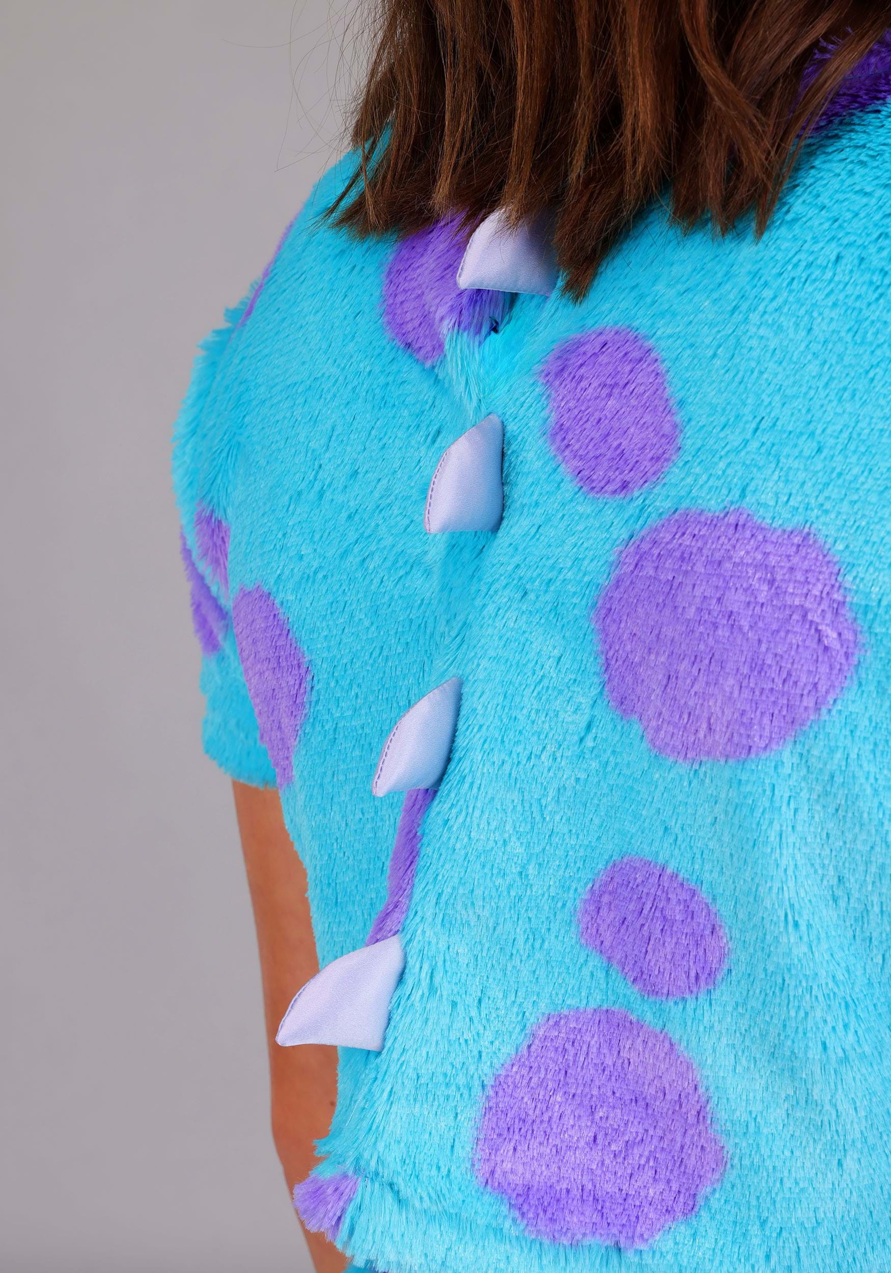 The short-sleeved faux-fur top and matching skirt are made for movement, detailed with Sulley's signature spots and soft satin back spikes. The tail is lightly stuffed and sewn right onto the skirt. Plush gloves and their satin claws add playful edge, while the comfy headband tops it off with curved, embroidered horns. The whole look is light, bold, and perfect for a Halloween night out in Monstropolis style.