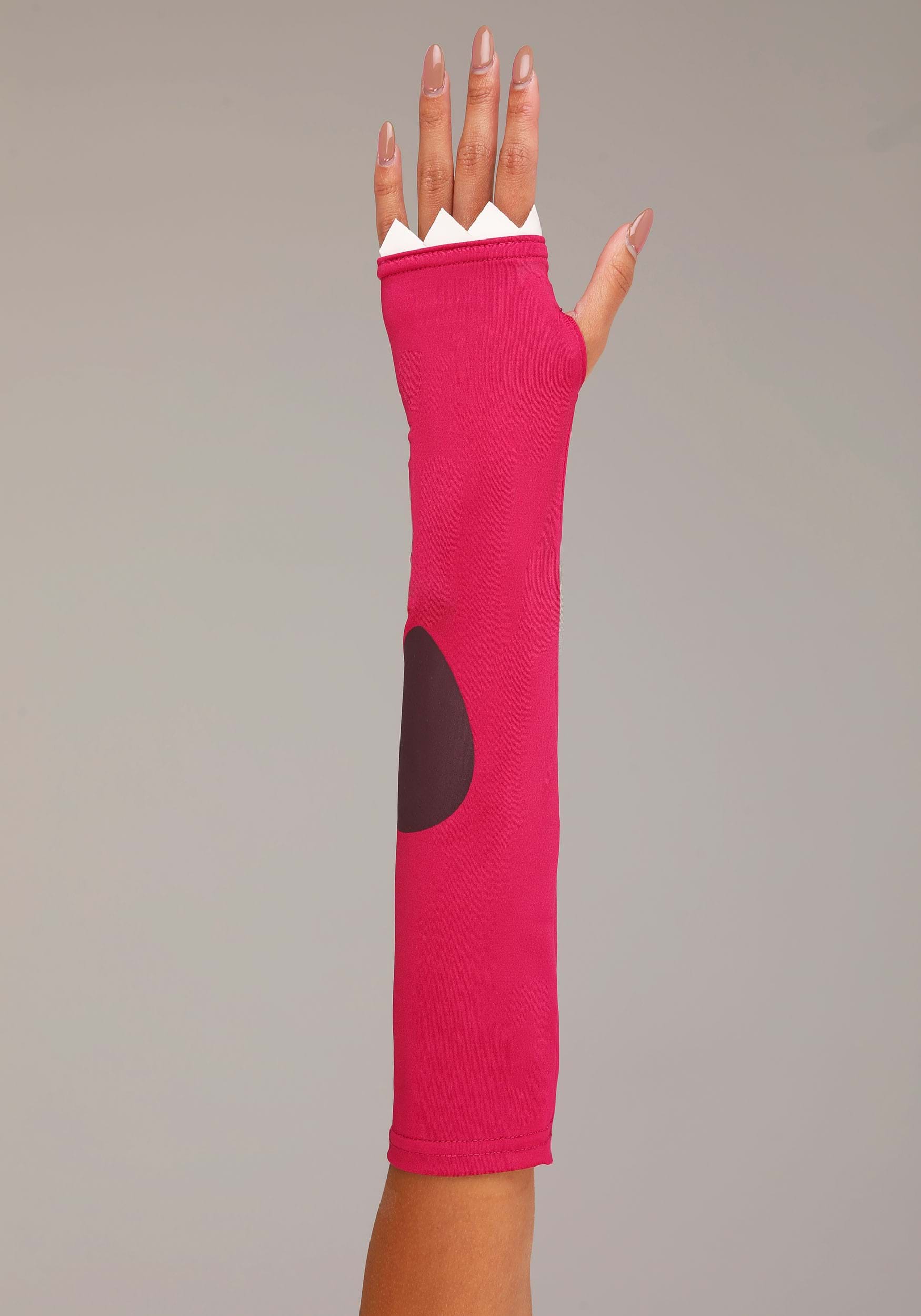 The attached hood steals the scene with its dino-style head shape and soft, plushy spikes running down the back—adorably fearsome from every angle. Matching arm-length gloves add a wild touch with their claw-like tips and coordinating pink-and-black color scheme. Whether you’re stomping through the dance floor or ruling the costume contest, this ensemble keeps your dino swagger on full display.