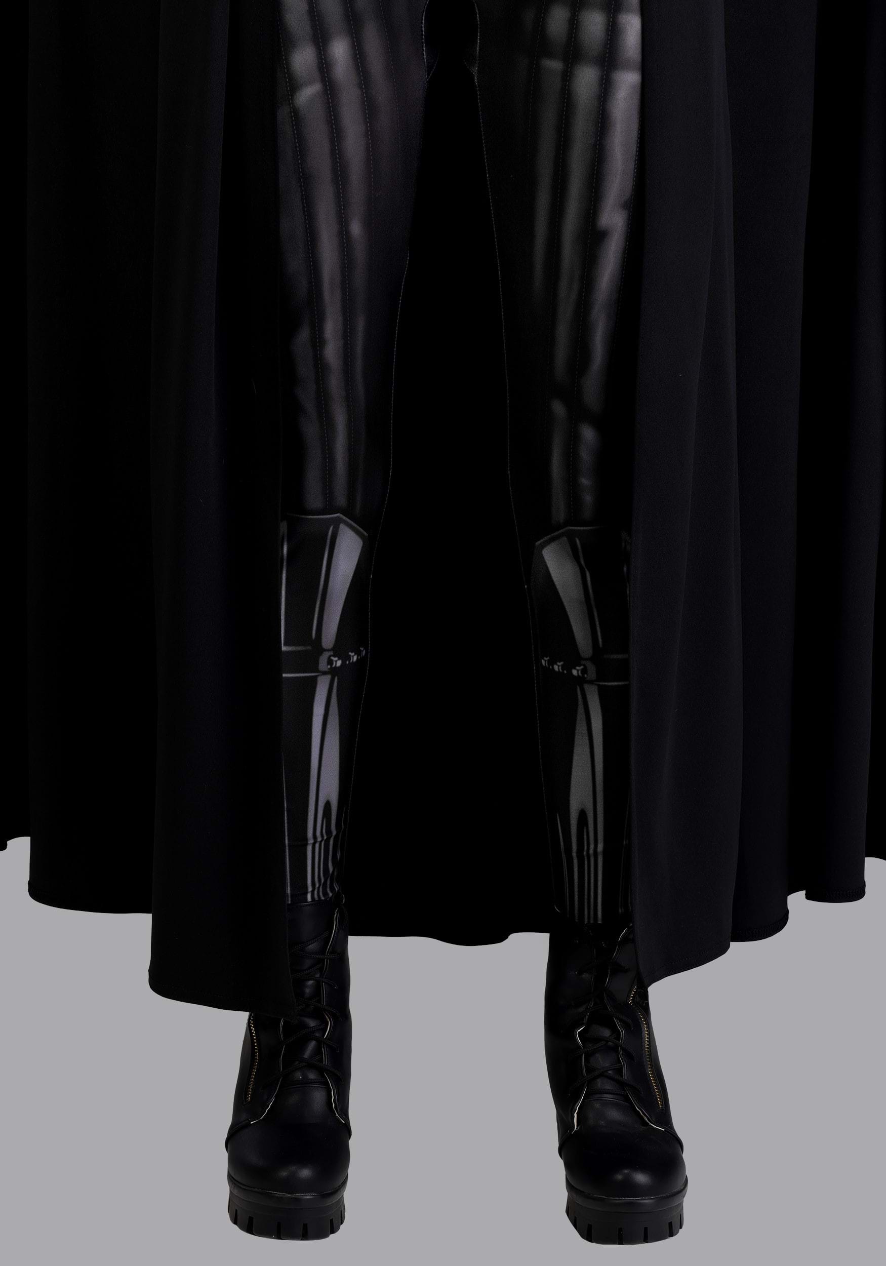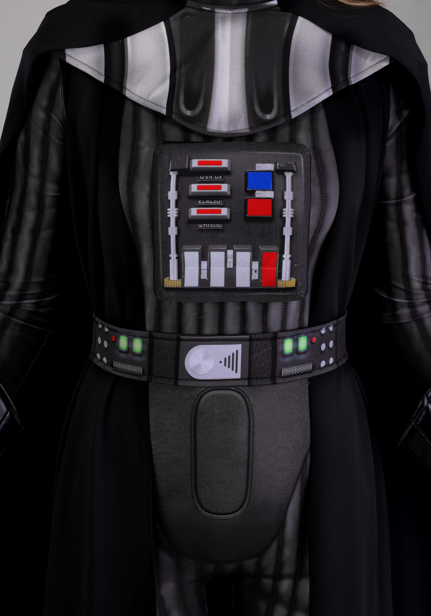 A flat printed belt wraps around the waist and features graphic console details, fastening in the back for a secure hold. The full-length cape attaches over the chest piece with a hidden hook and eye closure, cascading dramatically to the floor, perfect for storming Halloween parties or commanding attention from Rebels and Imperials alike.