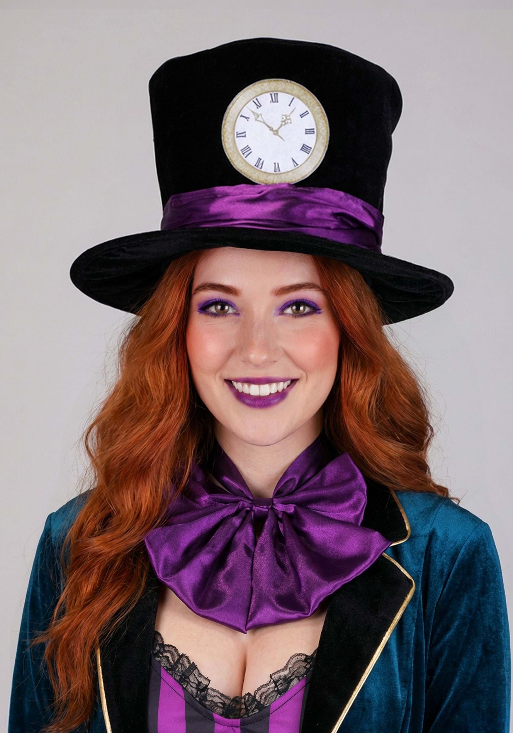 No tea party host would be complete without a proper hat, and this towering accessory delivers with unmistakable flair. Paired with a vibrant purple satin bowtie that fastens neatly at the neck, the look comes together with a flourish that feels both refined and playfully extravagant.