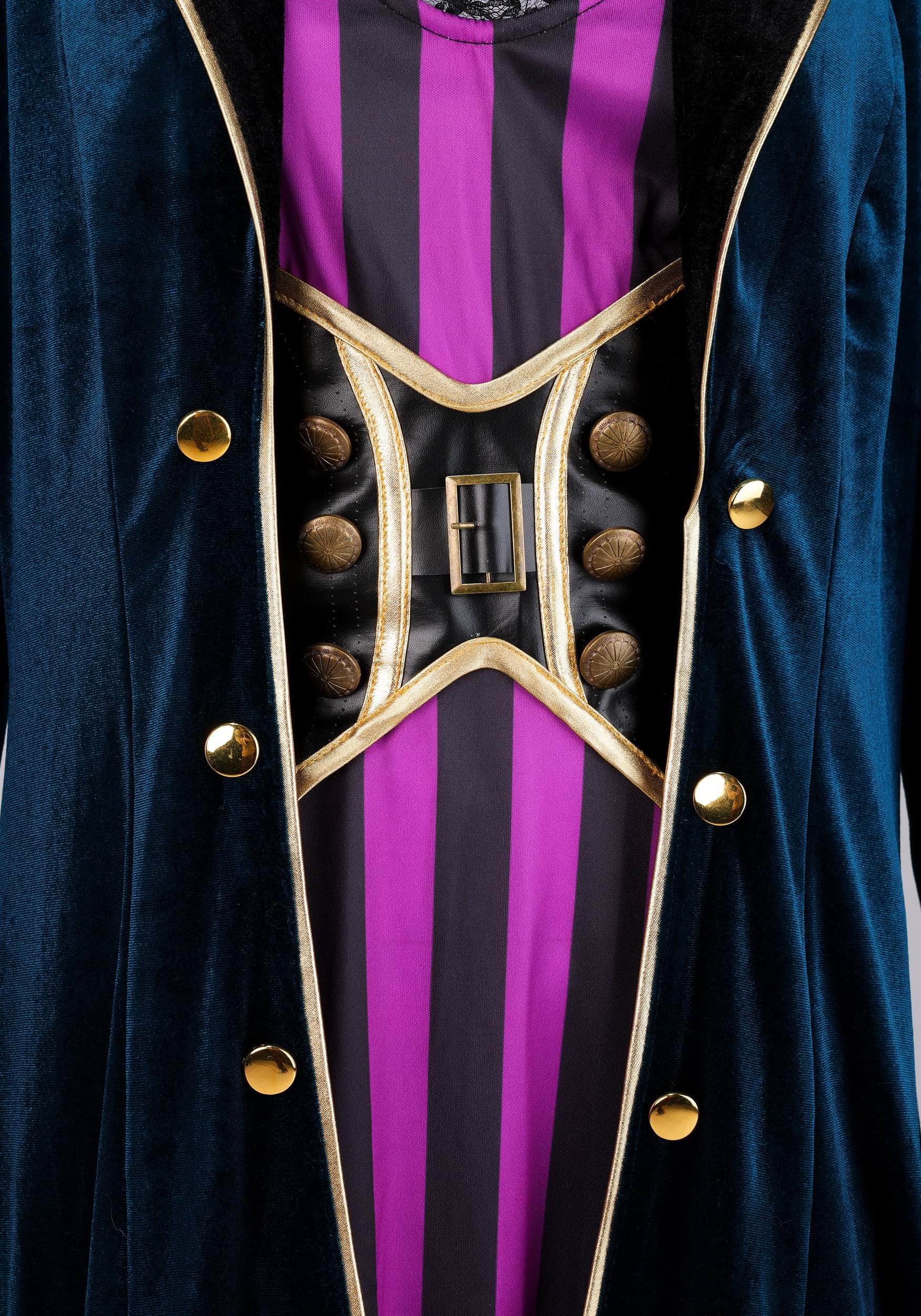The rich turquoise jacket, crafted from soft velvet, drapes beautifully and adds a regal touch to the look. Decorative buttons line each side, while a playful checkered pattern trims the hem, creating a striking contrast that feels delightfully out of the ordinary. Beneath, the black and purple striped dress peeks through, bringing depth and dimension to the ensemble.